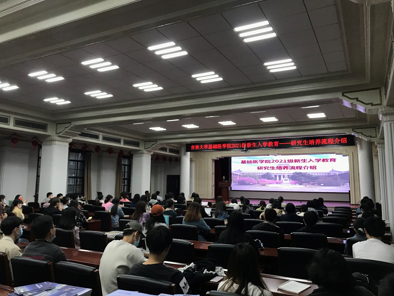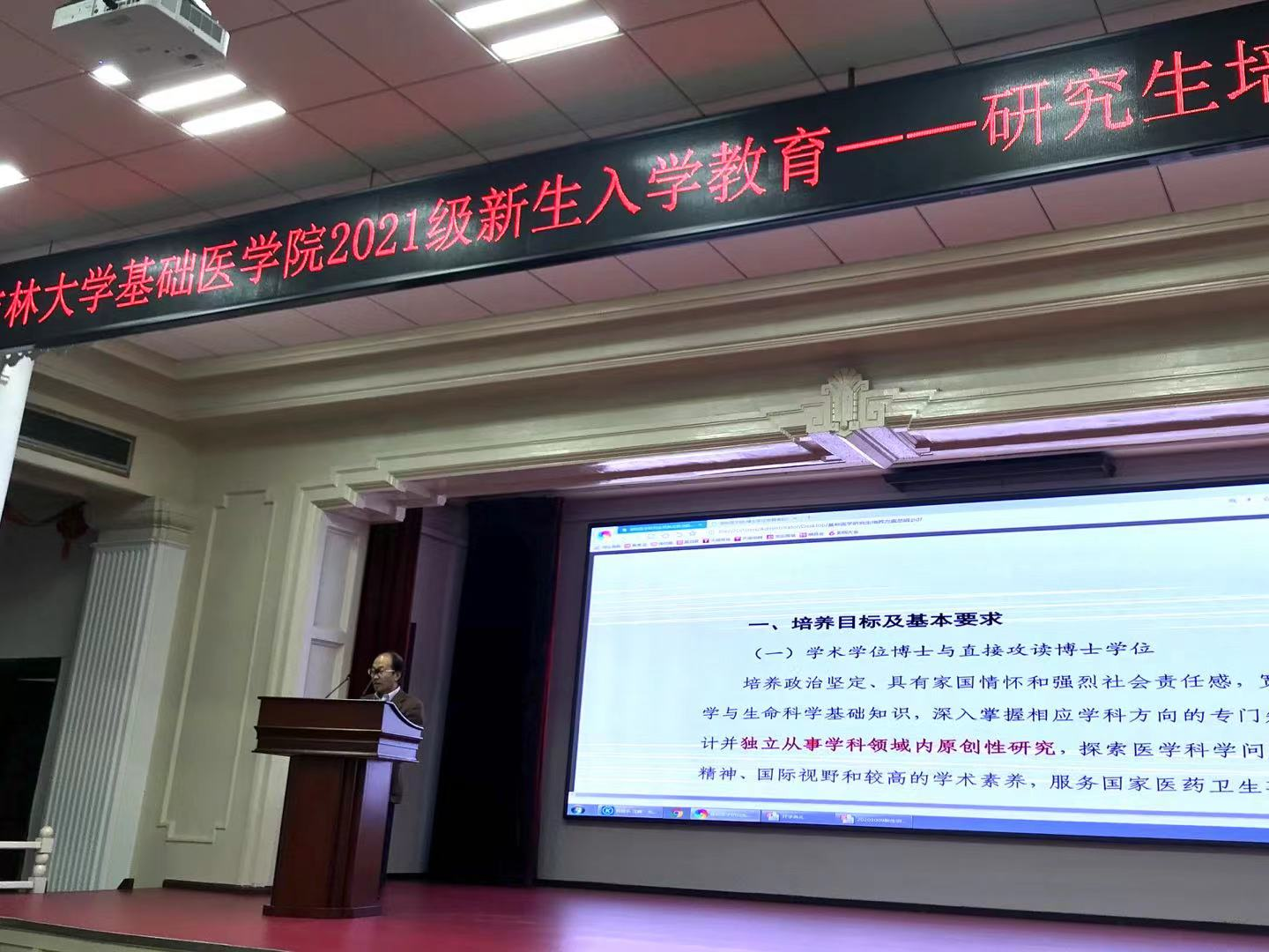 基础医学院新生入学教育活动紧紧围绕关爱学生、助力学生、服务学生的要求,着力提高研究生的思想水平、培养标准。为了尽快使同学们完成从本科生到研究生角色的转换,更好地适应研究生阶段的学习生活。基础医学院于2021年10月9日在二楼报告厅召开研究生培养流程培训会议。会议由基础医学院副院长李洪岩、综合办公室主任丁红枫主讲,学院研究生工作团队及2021级全体新生参加了会议。会议同时进行线上直播。