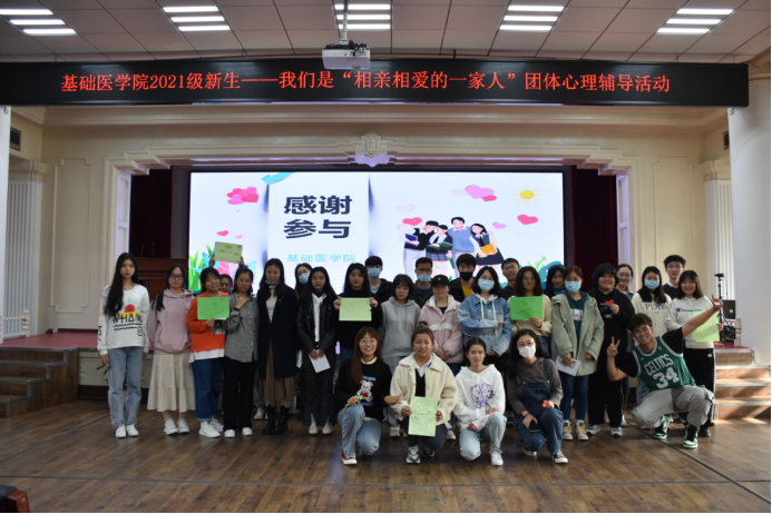 为加强2021级新生互相交流,提高同学们的心理健康水平,促进研究生全面发展和健康成长。基础医学院研究生会于11月5日在吉林大学基础医学院二楼报告厅举办了“相亲相爱一家人”团体心理辅导活动。基础医学院学生朋辈心理辅导员赵鹤主持,学院研究生工作团队及2021级全体新生参与此次活动。