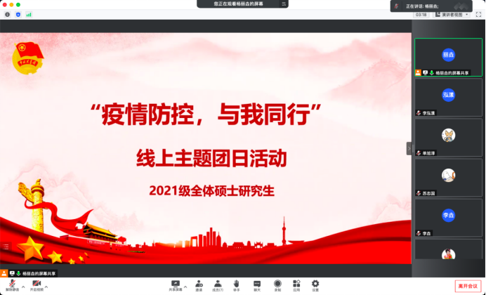为充分发挥团学组织在防疫抗疫过程中的先锋模范作用,进一步加强疫情防控期间学生的思想引导,凝聚防疫信心。2022年4月15日,基础医学院2021级硕士团支部在线上开展了主题为“疫情防控,与我同行”的团日活动。基础医学院团委负责人、研究生辅导员孙佳钰老师以及2021级硕士全体团员参加,活动由2021级硕士团支书杨丽垚主持。