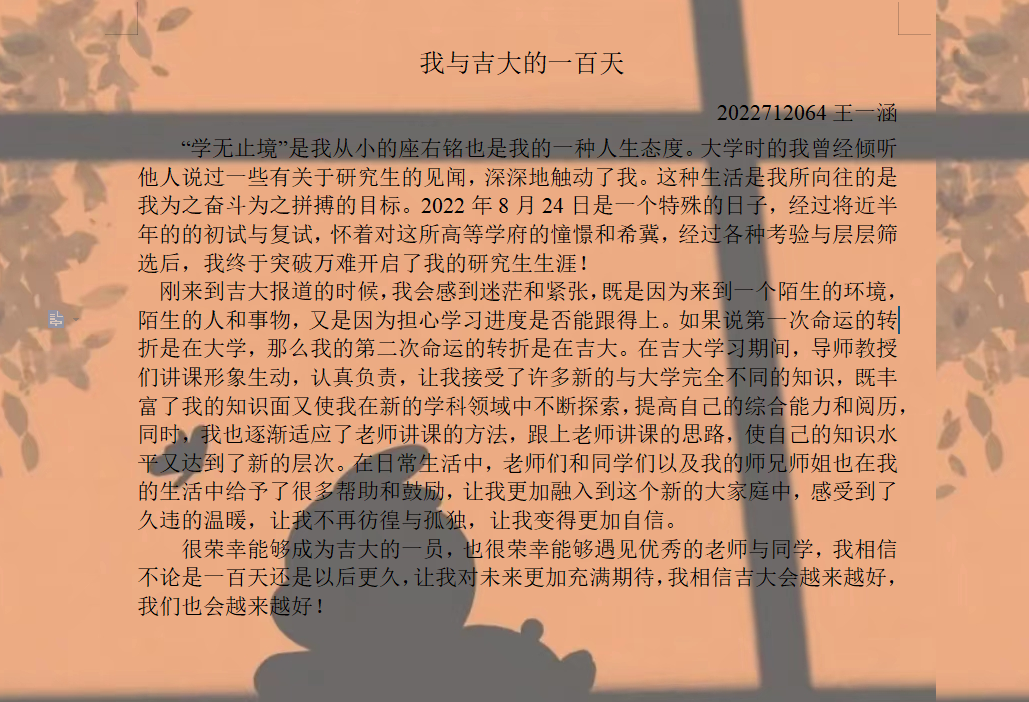 一落叶而知秋,惟愿你我心向阳不忧伤,一路随心而行,一路随遇而安。不知不觉中,2022级的新同学们也已经来到吉林大学100天了,在过去的100天里,也有自己和吉林大学独特的故事发生.值此100天之际,基础医学院特面向2022级研究生新生开展“我与吉大的100天”作品征集活动,让同学们写出自己的心声。