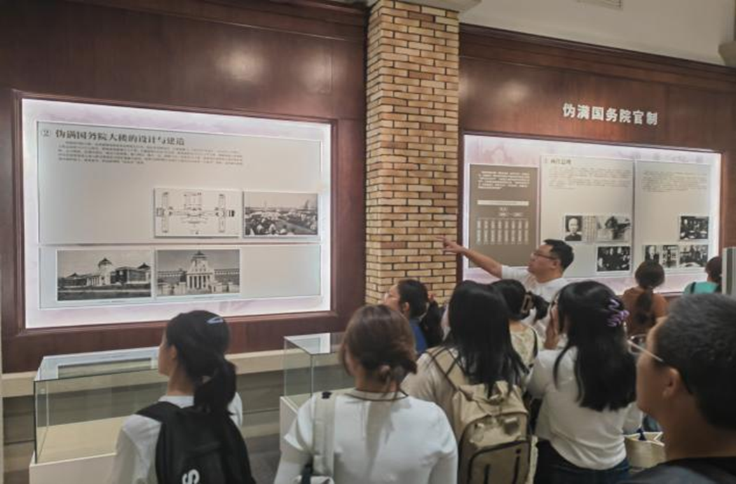 在学院党委副书记李东洋、研究生辅导员孙佳钰的带领下,参观了基础楼五楼的爱国主义教育基地一一伪满洲国警示教育展览馆。这里陈列着伪满国务院大楼的设计与建造的简介、伪满国务院官制、伪满洲国重大历史事件简编、和日本战败递交投降书的人物模型。