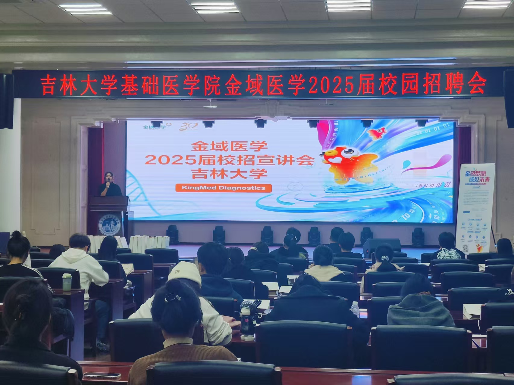 随后,吉林大学校友、吉林金域市场部血液肿瘤条线产品经理、科研负责人郇有为学长给同学们分享了他在金域医学集团的成长故事。他从自身角度出发为同学们讲述了选择金域公司的原因以及在金域的发展;郇先生的亲身经历和心路历程,让在场的同学们感受到了金域医学集团良好的工作氛围和发展平台。最后工作人员详细介绍了金域医学2025年校园招聘的岗位需求、应聘方式以及招聘流程,并提醒同学们注意查收面试信息。