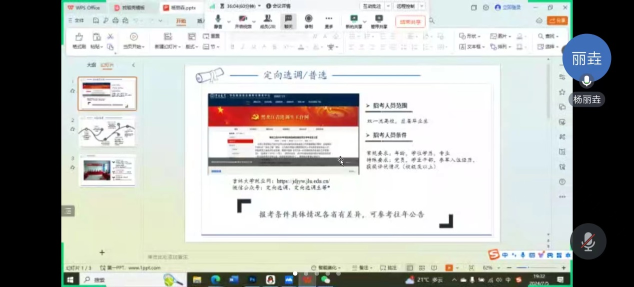 刘丹丹同学从招考资讯获取和笔面试准备两方面做了经验分享。她首先详细介绍了招考资讯的获取与筛选,介绍了常用的几种信息获取渠道,在此基础上介绍了她所了解的各种编制类的考试时间及考试内容、公务员事业编辅导员教师编考试内容重合与区别以及东三省定向选调条件和薪资待遇。此外,她详细介绍了自己的备考经历,分享了笔面试准备过程中的参考资料。最后,她提醒同学们一定要尽自己所能早做准备,在做好科研工作的同时,合理规划备考时间,以充足的准备把握好每一次机会。