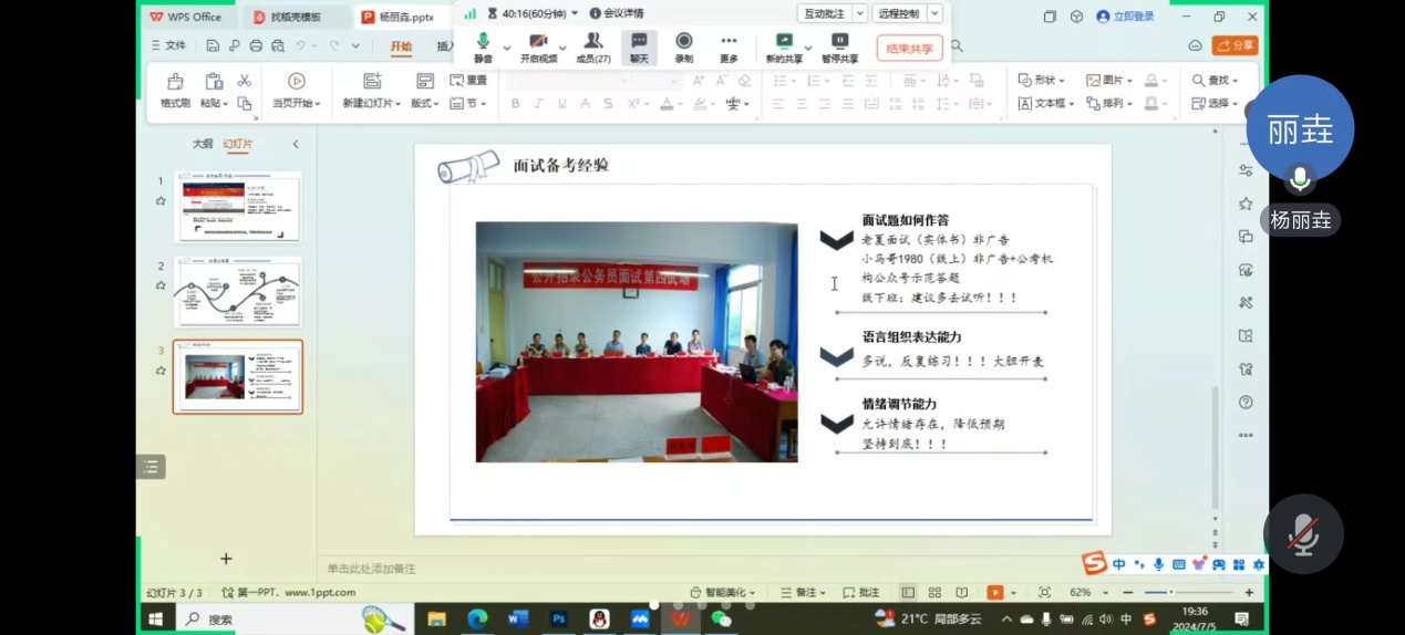 杨丽垚同学从备考经验与备考心态两方面做分享。她首先详细介绍了定向选调与普选的区别,提醒同学们根据自身情况做选择,及时关注学校官网及相关考公公众号的最新消息,并对考公的整体流程进行了简要的介绍,提醒同学们尽早准备,之后,她分享了面试备考经验,从多方面分享了面试题如何作答、语言组织表达能力如何提升。最后,她提醒同学们一定要提高自身的情绪调节能力,正确面对备考过程中的得与失,明确目标,坚定的向目标努力,方能有始有终。