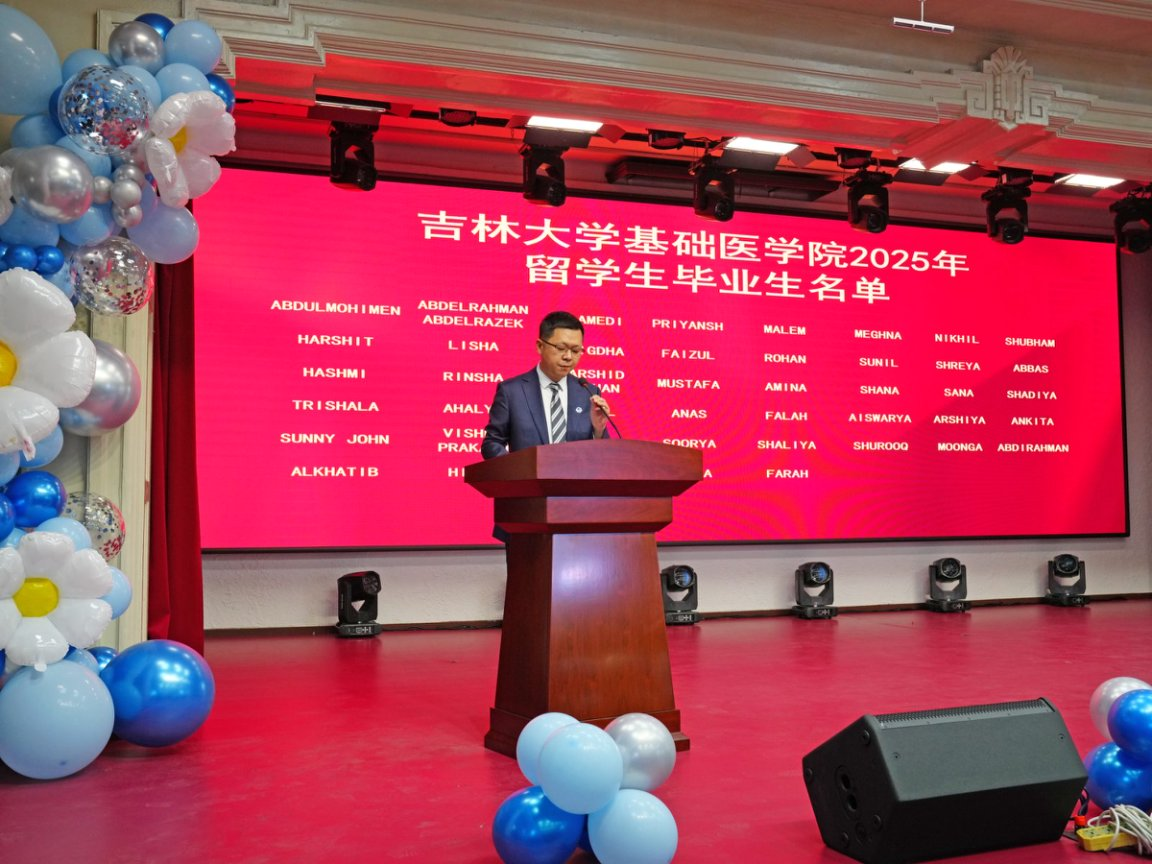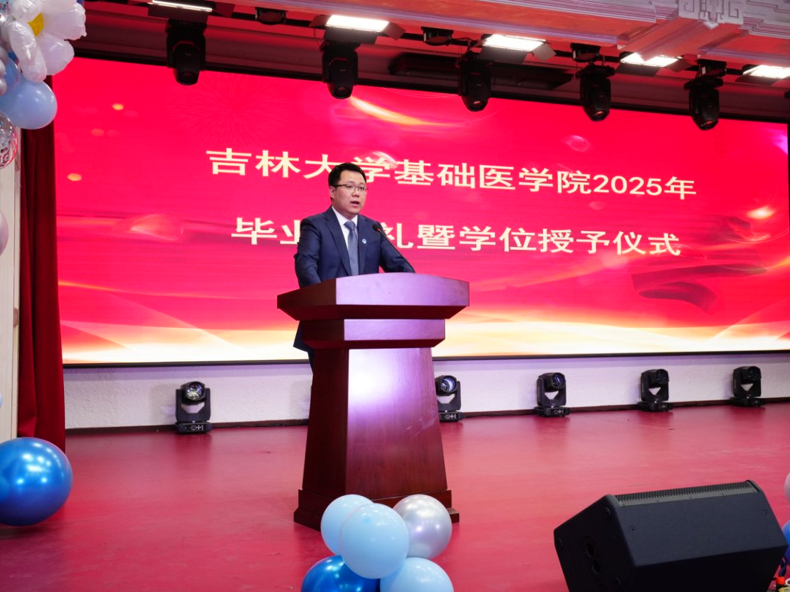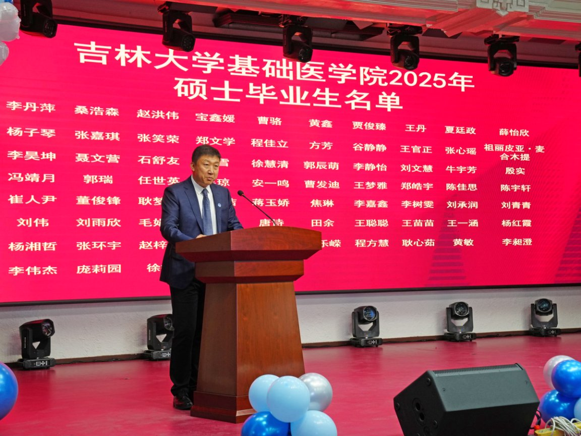 基础医学院院长王放致辞,向顺利完成各阶段学业、即将告别母校、走向世界的 79 名基础医学硕士和博士研究生以及 50 名临床医学国际学生表示最热烈的祝贺。近年来,基础医学院在吉林大学医学教育创新发展中取得了一系列令人骄傲的成绩,例如吉林大学人参学院的成立、高水平论文的发表以及我院开设的可提前锁定优质生源的吉林大学首个预科医学项目,这些都与大家的共同努力密不可分。展望未来,所有毕业生都将面临更多的挑战与机遇,面对人工智能新生产力的出现,希望各位毕业生能牢记“刻苦学习,探求真理,诚实细致”的座右铭,在医学科研和疾病诊断治疗中抢占先机,并借助人工智能时代的变革,以自身之力书写属于自己的人工智能篇章,更好地为人类的健康和福祉服务。让我们共同携手,为构建人类命运共同体而努力,让全世界人民的健康与团结得以实现!