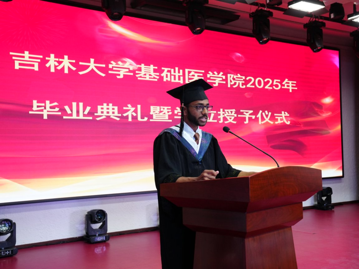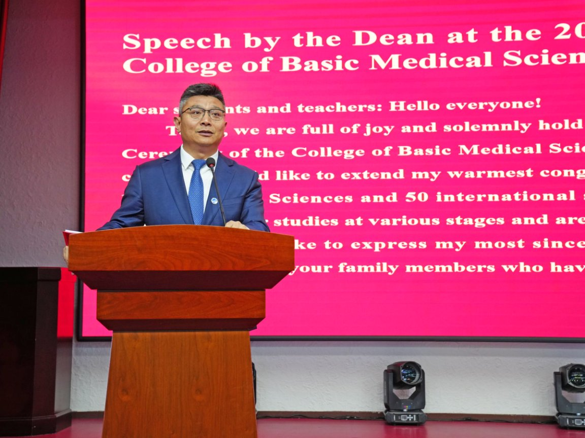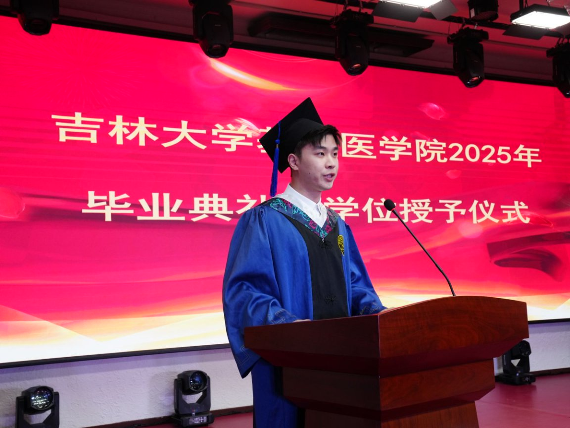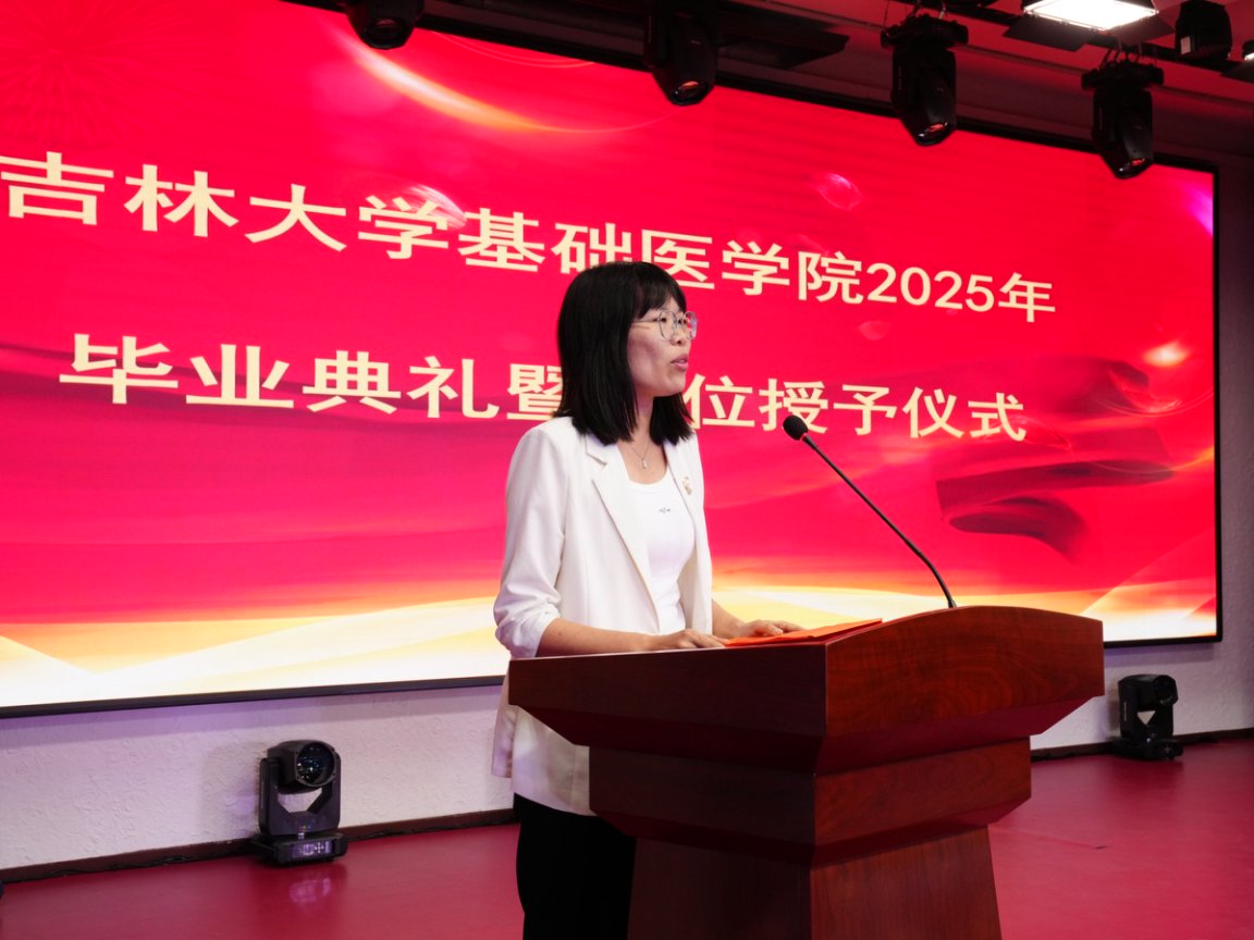 基础医学院院长王放致辞,向顺利完成各阶段学业、即将告别母校、走向世界的 79 名基础医学硕士和博士研究生以及 50 名临床医学国际学生表示最热烈的祝贺。近年来,基础医学院在吉林大学医学教育创新发展中取得了一系列令人骄傲的成绩,例如吉林大学人参学院的成立、高水平论文的发表以及我院开设的可提前锁定优质生源的吉林大学首个预科医学项目,这些都与大家的共同努力密不可分。展望未来,所有毕业生都将面临更多的挑战与机遇,面对人工智能新生产力的出现,希望各位毕业生能牢记“刻苦学习,探求真理,诚实细致”的座右铭,在医学科研和疾病诊断治疗中抢占先机,并借助人工智能时代的变革,以自身之力书写属于自己的人工智能篇章,更好地为人类的健康和福祉服务。让我们共同携手,为构建人类命运共同体而努力,让全世界人民的健康与团结得以实现!