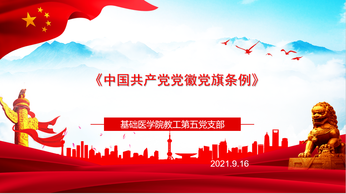 2021年9月16日下午,基础医学院第五党支部召开了支部党员大会,认真学习了《习近平总书记给全国高校黄大年式教师团队重要回信精神》和《中国共产党党徽党旗条例》。会议由党支部书记何旭主持。