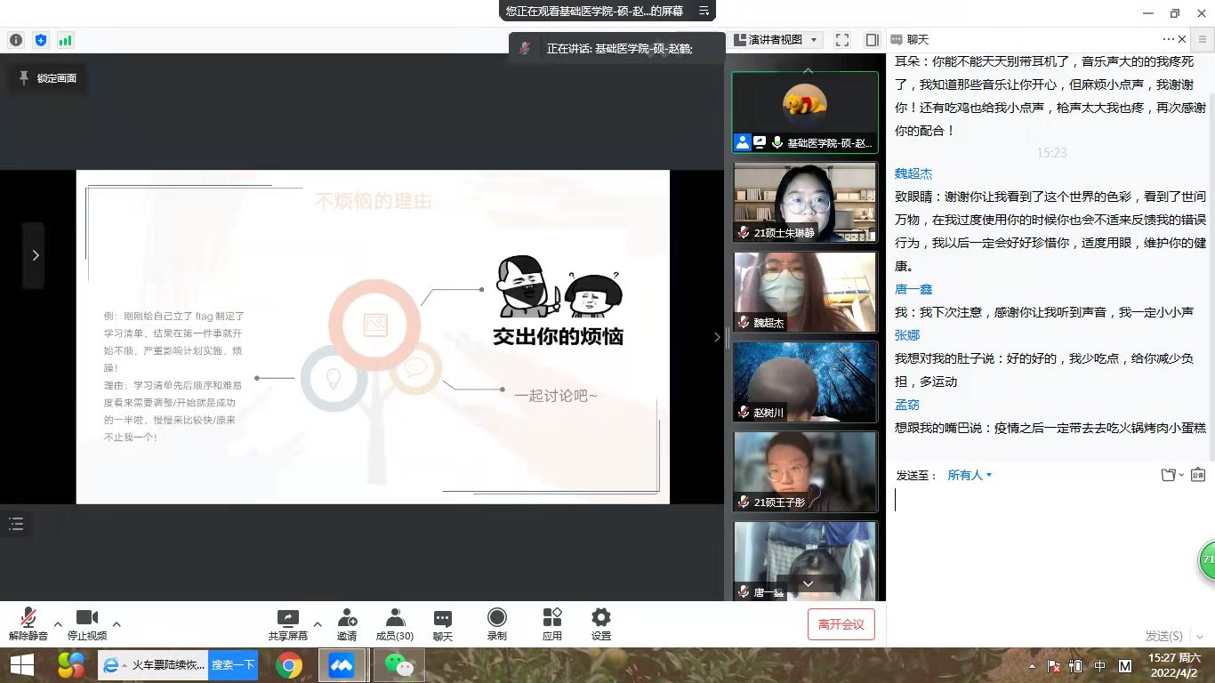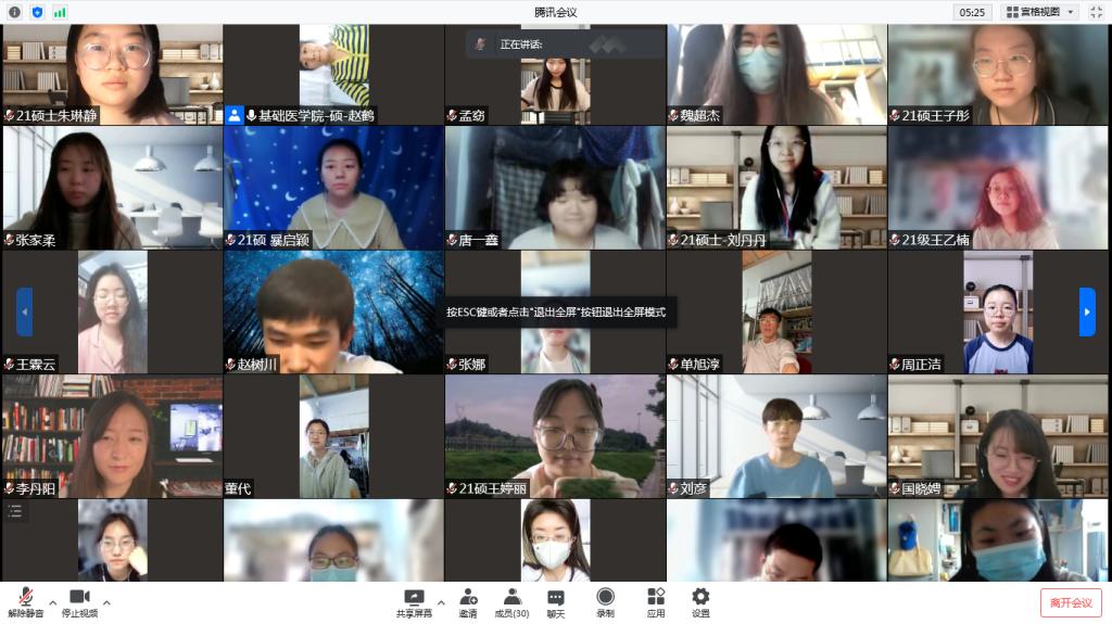为缓解抗疫期间同学们的心理压力,提高大家战胜疫情的信心。4月10日,在学校心理健康教育中心的指导下,基础医学院开展了“心灵沟通”主题班会,学院全体研究生齐聚线上,共话“心”事。