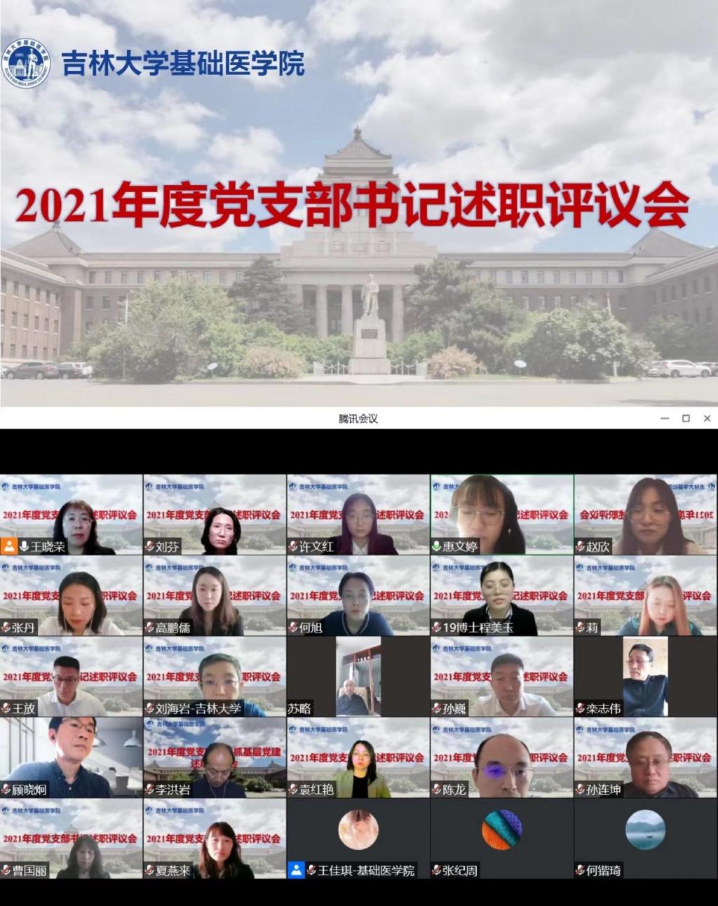 为深入推进全面从严治党和提升党支部工作实效,按照学校党委《关于开展2021年度全校基层党组织书记抓基层党建述职评议考核的通知》要求,2022年4月25日,基础医学院党委通过视频会议组织召开2021年度党支部书记述职评议会。学院领导班子成员、党委委员、各党支部书记参加了测评会。学校党建联络员栾志伟,党史学习教育第三指导组组长顾晓炯、副组长曲思伟、组员何锴琦参会指导。会议由基础医学院党委书记王晓荣主持。