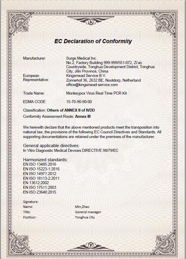 为推进产学研结合,贯彻落实国家关于加强自主创新、建设创新型国家战略决策的重要举措,助力猴痘疫情快速防控,基础医学院王放教授团队继研发4款COVID-19快速诊断产品后,应国家和社会需求,近期开展了关于猴痘检测试剂盒的研究。据中国吉林网报道,截止2022年6月1日,全球30个非猴痘流行国家和地区已上报550多例猴痘确诊病例。王放教授团队联合吉林双正医疗科技有限公司,依托吉林省科技厅“精准感染病学重点实验室”、吉林大学转化医学院、通化市科技局和吉林双正医疗科技有限公司共同签署的“体外诊断试剂POCT研发技术平台”等科研平台,紧急研制出了两种猴痘病毒检测试剂盒——猴痘病毒抗原检测试剂盒(胶体金法)和猴痘病毒核酸检测试剂盒(荧光PCR法),并于2022年5月24日获得了CE认证。这是王放教授团队在传染病诊断检测方面又一重要成果。
