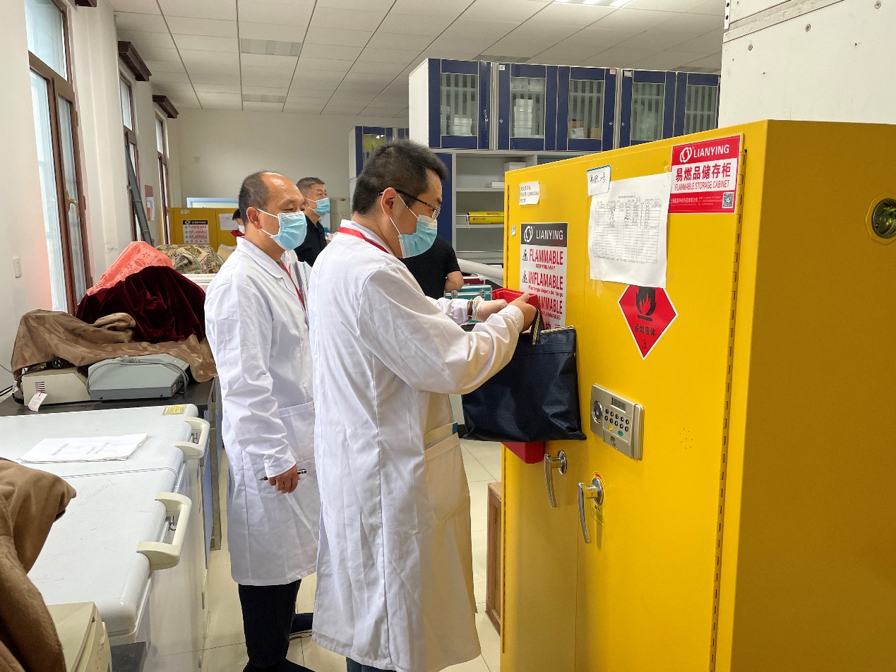 专家组一行先后对学院解剖学系、组织与胚胎学系、药理学系等科研实验室进行了全面检查,实地查看包括实验室危化品出入库管理、使用情况,实验废弃物处置等情况,重点查看了实验室危化品管理的相关工作情况。