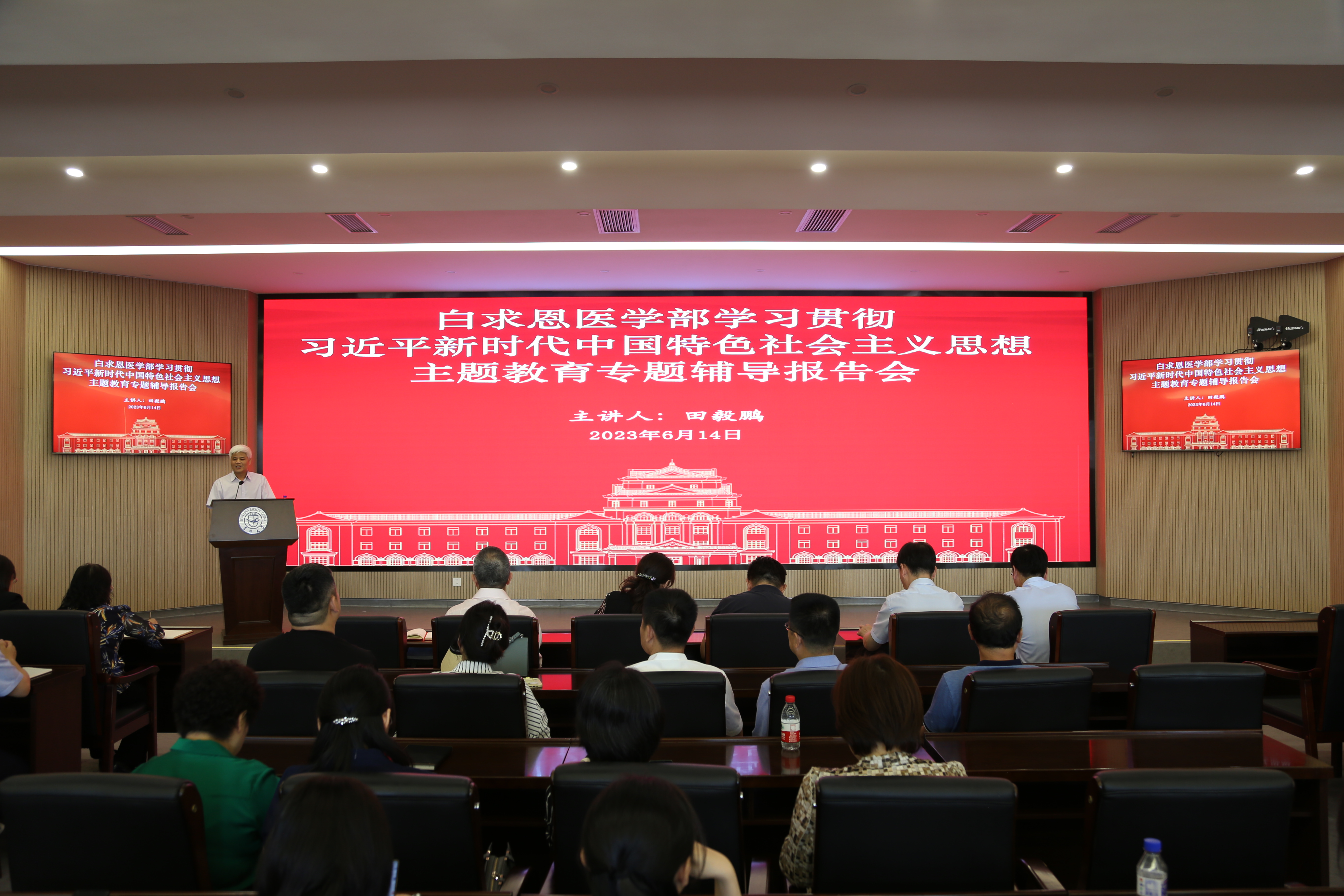 6月14日下午,基础医学院党委组织读书班成员、部分教工党员前往第一教学楼白求恩大讲堂,参加由医学部机关、基础医学院、公共卫生学院、药学院、护理学院联合举办的学习贯彻习近平新时代中国特色社会主义思想主题教育专题辅导报告会。会议由白求恩医学部党工委常务副书记屈英和主持。