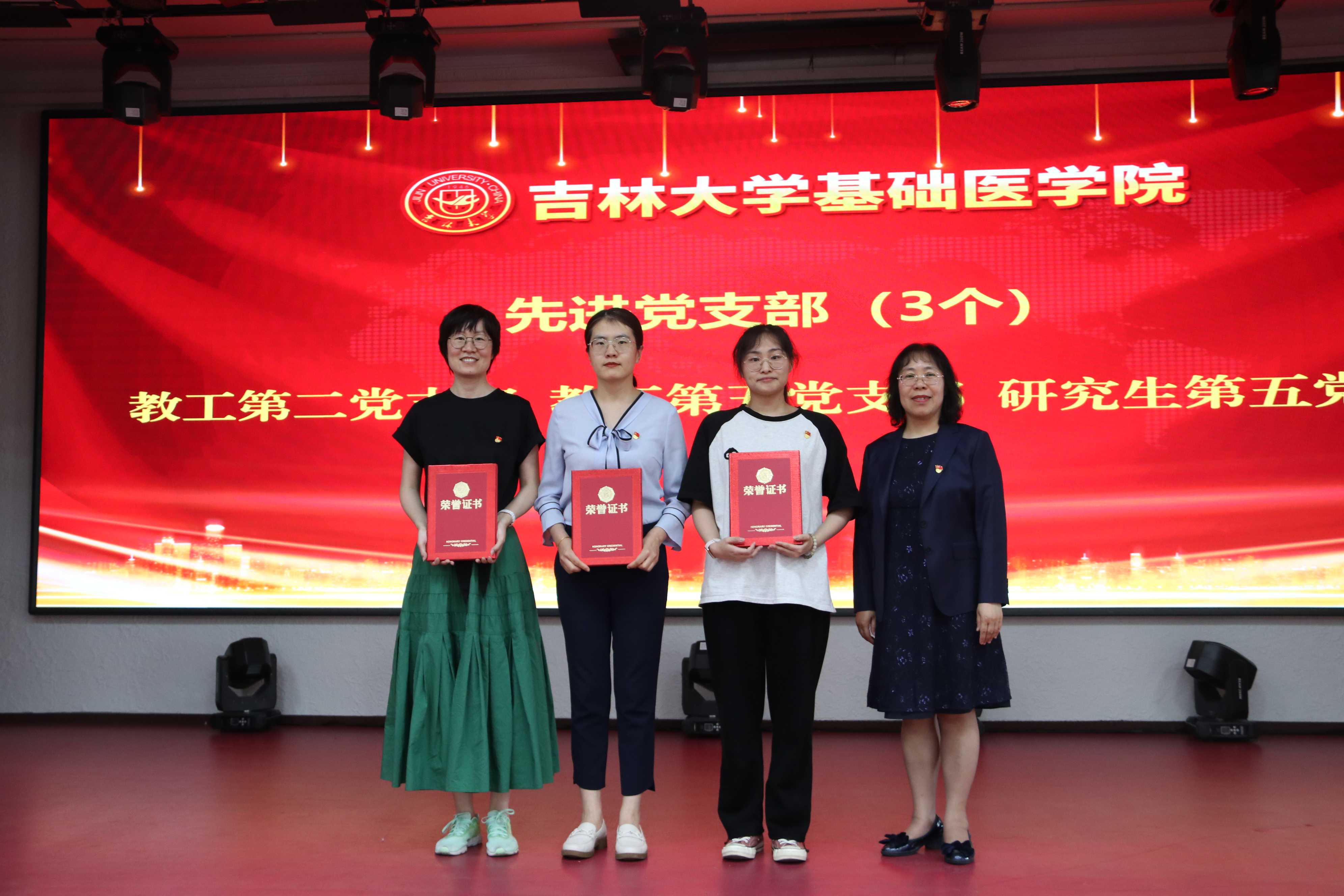 会上,副院长李洪岩宣读了《中国共产党吉林大学基础医学院委员会关于表彰优秀共产党员、优秀党务工作者和先进党支部的决定》。学院党委委员、领导班子成员为先进党支部、优秀党务工作者和优秀共产党员代表颁发了荣誉证书。优秀党务工作者刘芬作为代表上台发言。