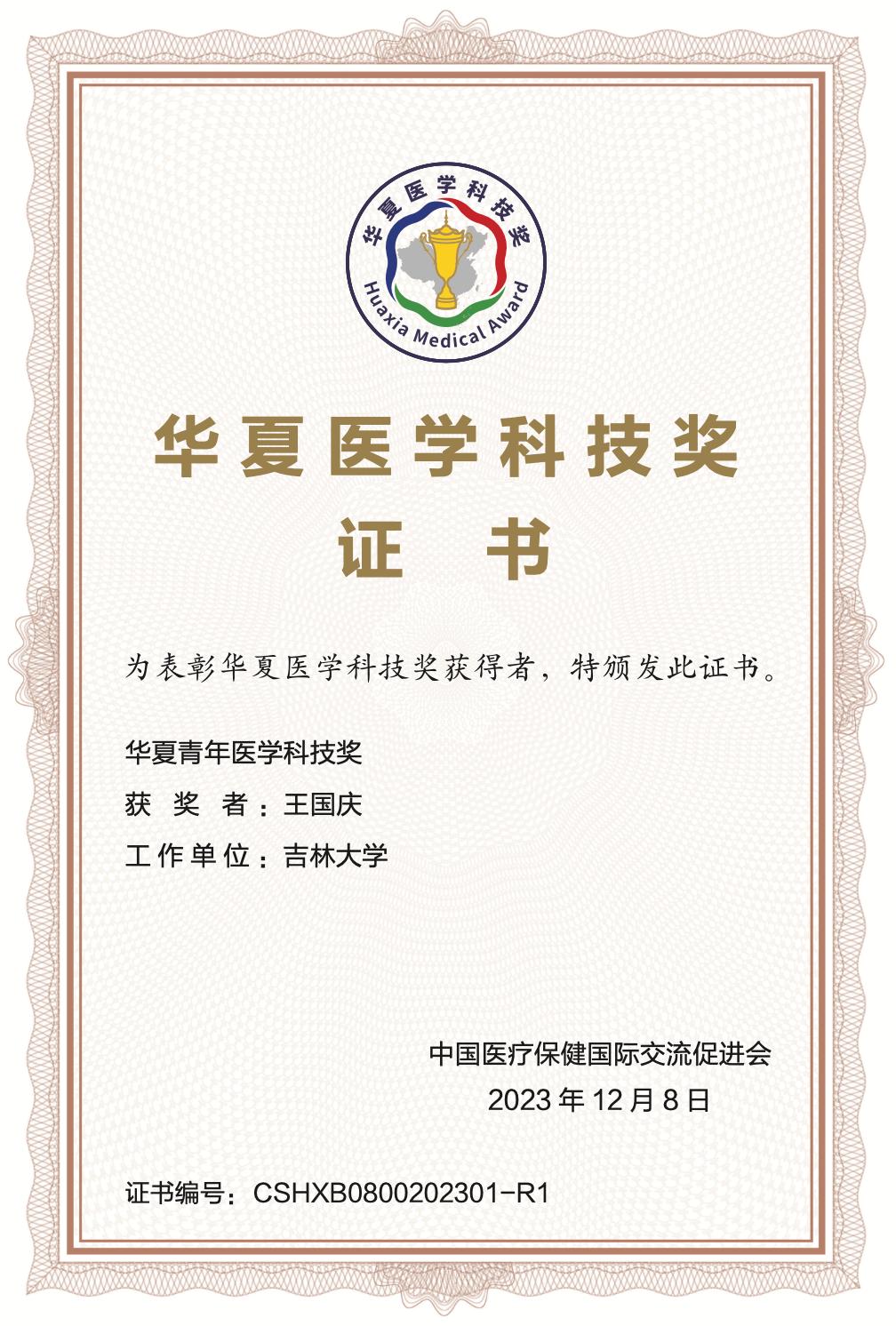 12月8日,2023年度华夏医学科技奖正式公布,吉林大学基础医学院王国庆教授荣获华夏青年医学科技奖,是首次获此殊荣的15位青年学者之一。