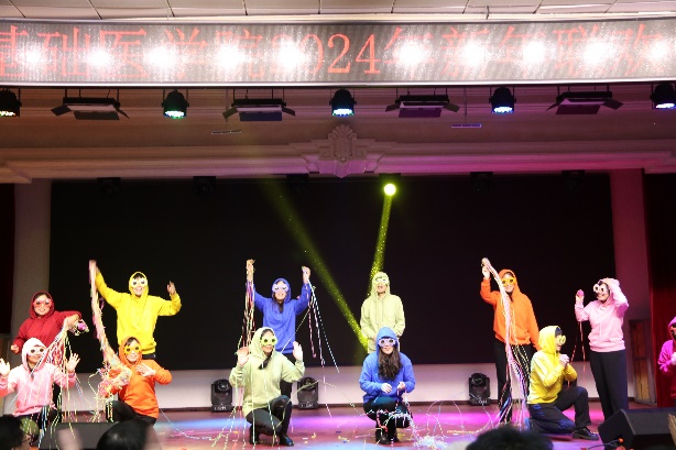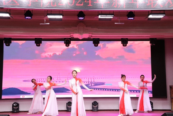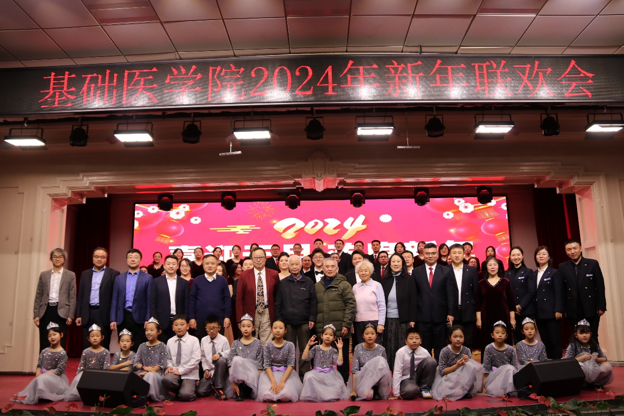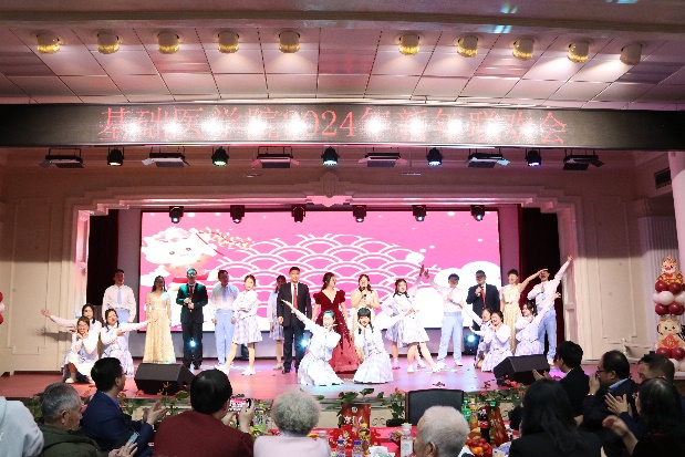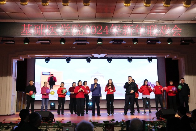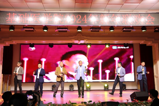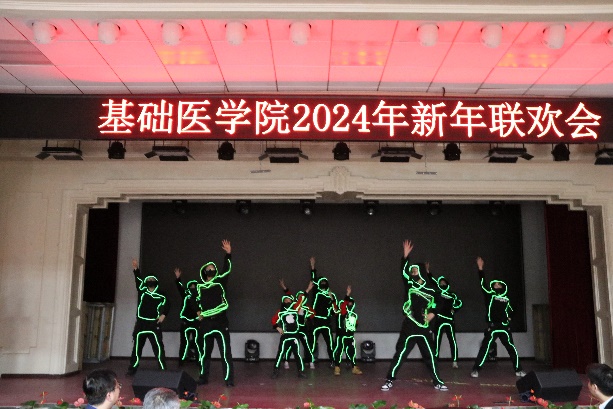 新年联欢会在病理生理学系、药理学系、生理学系以及一综合老师们的扇子舞《骁》中正式拉开帷幕,几位老师翩翩起舞,将中华古典舞蹈完美的呈现;长春南湖实验中海小学的小小少年们带来的《青鸟》和《无与伦比的美丽》童声合唱,传递了纯真美好,释放了青春能量,也唱出了新时代少年的昂扬自信;组织学与胚胎学系的老师们带来的歌舞串烧《眉飞色舞之路灯下的小姑娘》以及病理学系的老师们带来的合唱《如愿》,欢快氛围的同时也饱含了对基础医学院的热爱与期盼;学院副书记李东洋、院长助理何侃与两位留学生共同献唱的《You Raise Me UP》,将不同文化的魅力融合在音符间,为师生带来了一次听觉盛宴;解剖学系的老师们带来的舞蹈《你想跳舞吗》,别具一格的荧光舞更是将联欢会的气氛推到了高潮;学院的研究生们带来的舞蹈《党旗飘扬的方向》以及吕东芳老师与齐达同学合唱的《在希望的田野上》,赞颂了中国共产党的不忘初心、继续前行的使命担当;生物化学学系、二综合、动物实验中心、测试平台的老师们的合唱《真心英雄》,唱出了学院教师对于每一位真心英雄的尊敬与仰慕,也唱出了对新的一年的期盼与向往;于永利老师与王丽颖老师带来的对唱《敖包相会》,将美好祝愿寄托在歌声中传遍整个会场;杨青、池光范几位老师合唱的《花心》,勾起了大家对经典歌曲的回忆;病原学系、免疫学系、细胞遗传学系以及三综合的老师们带来的舞蹈《贺新年》,展现了学院教职工蓬勃向上的精神面貌,赢得了阵阵喝彩;分子生物学系的老师和同学们带来的经典歌舞剧《哆来咪》,重温经典,并给大家介绍了谐音和形象记忆的学习方法;留学生们带来的精彩舞蹈《INDIAN RAGA》,绚丽的服装、欢快的音乐,交织出充满特色的异域风情;基础医学院合唱团的带来的《我们一起远航》,铿锵有力、激情澎湃,传递着团结与奋进,表达了对学院的美好祝愿。
