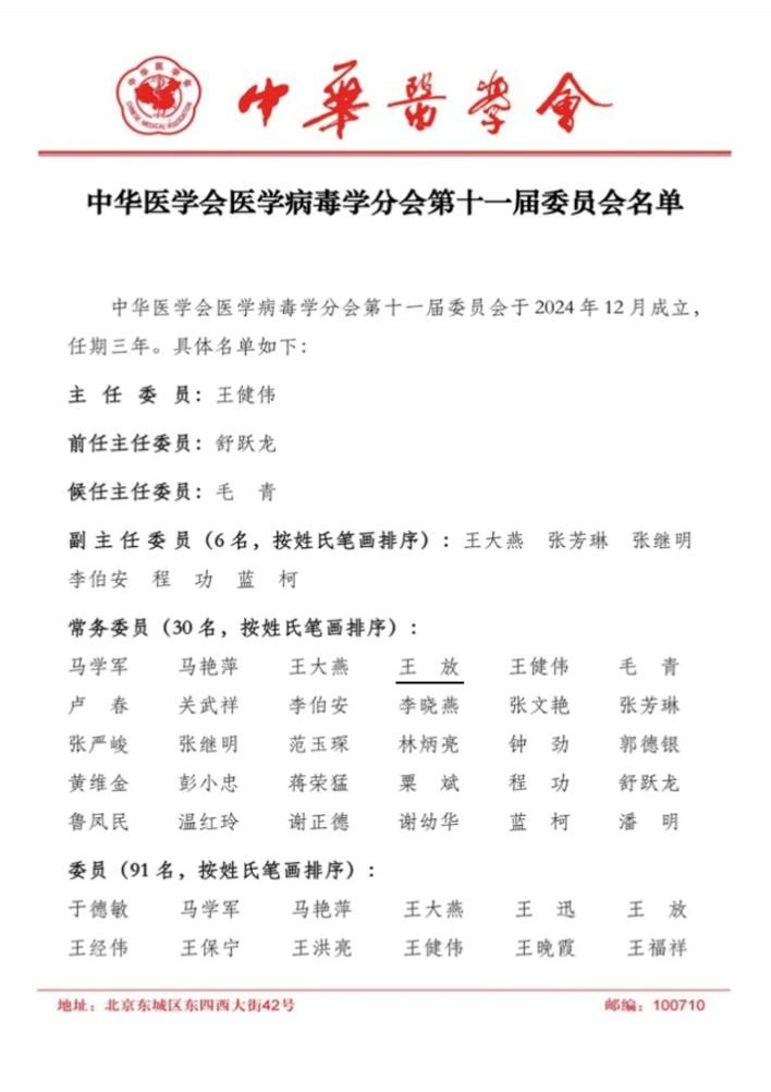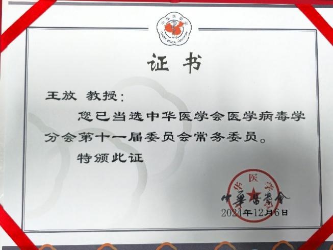 2024年12月6日,中华医学会医学病毒学分会换届选举会议在广东省广州市召开,我院病原生物学系王放教授当选中华医学会医学病毒学分会第十一届委员会常务委员。
