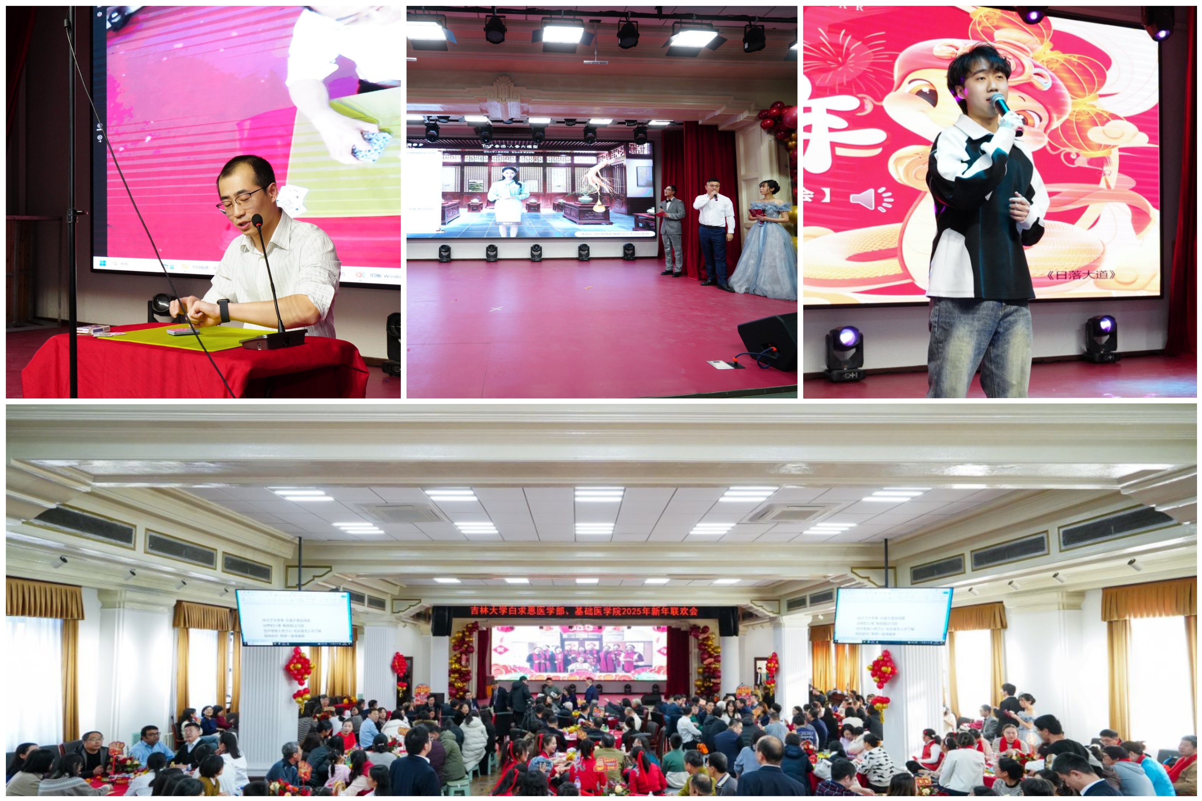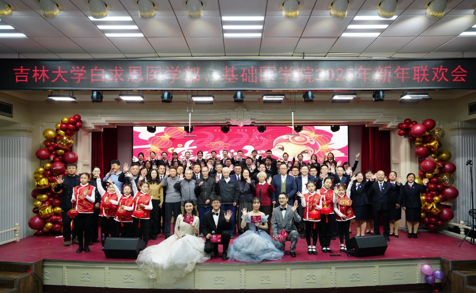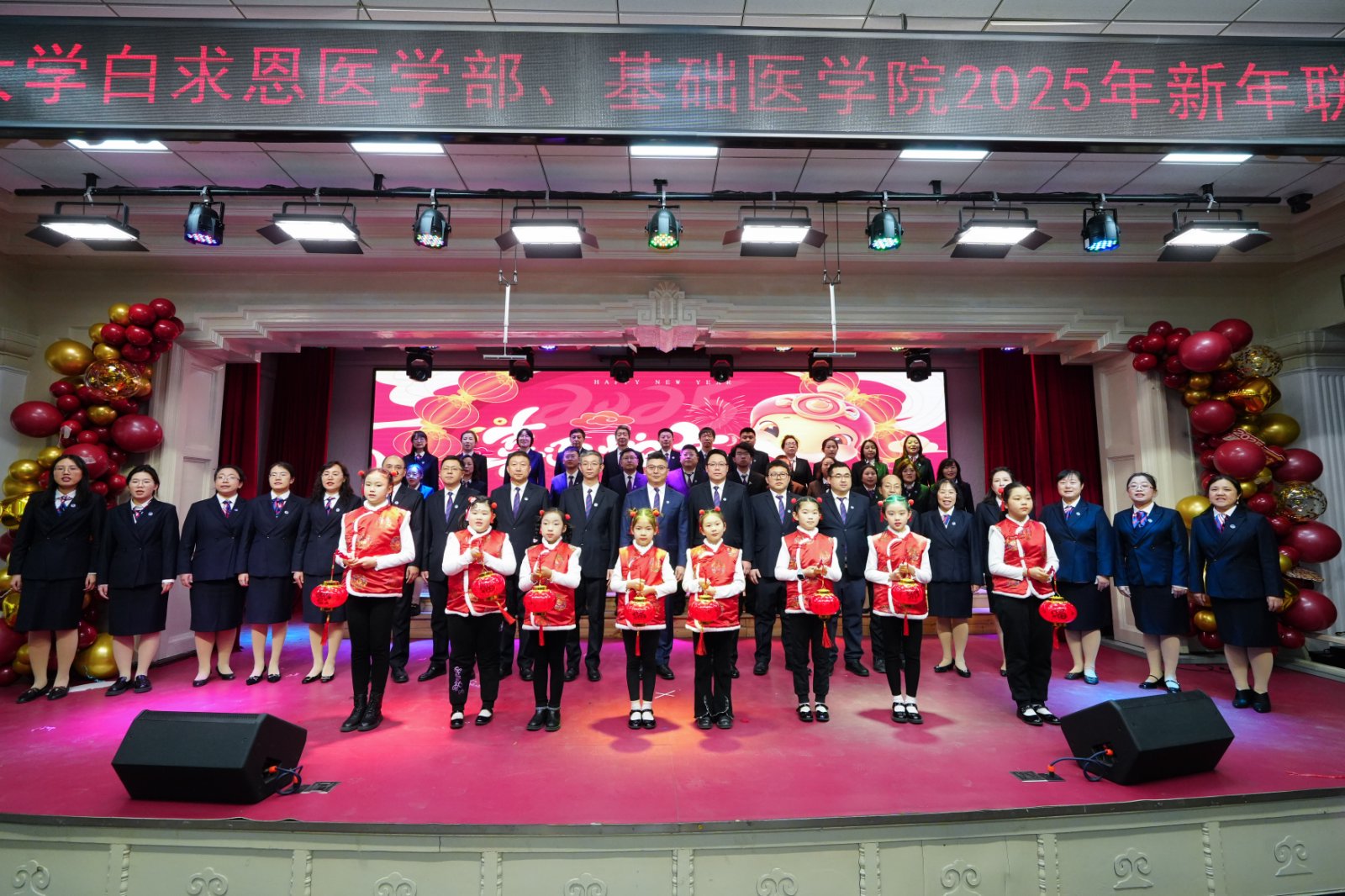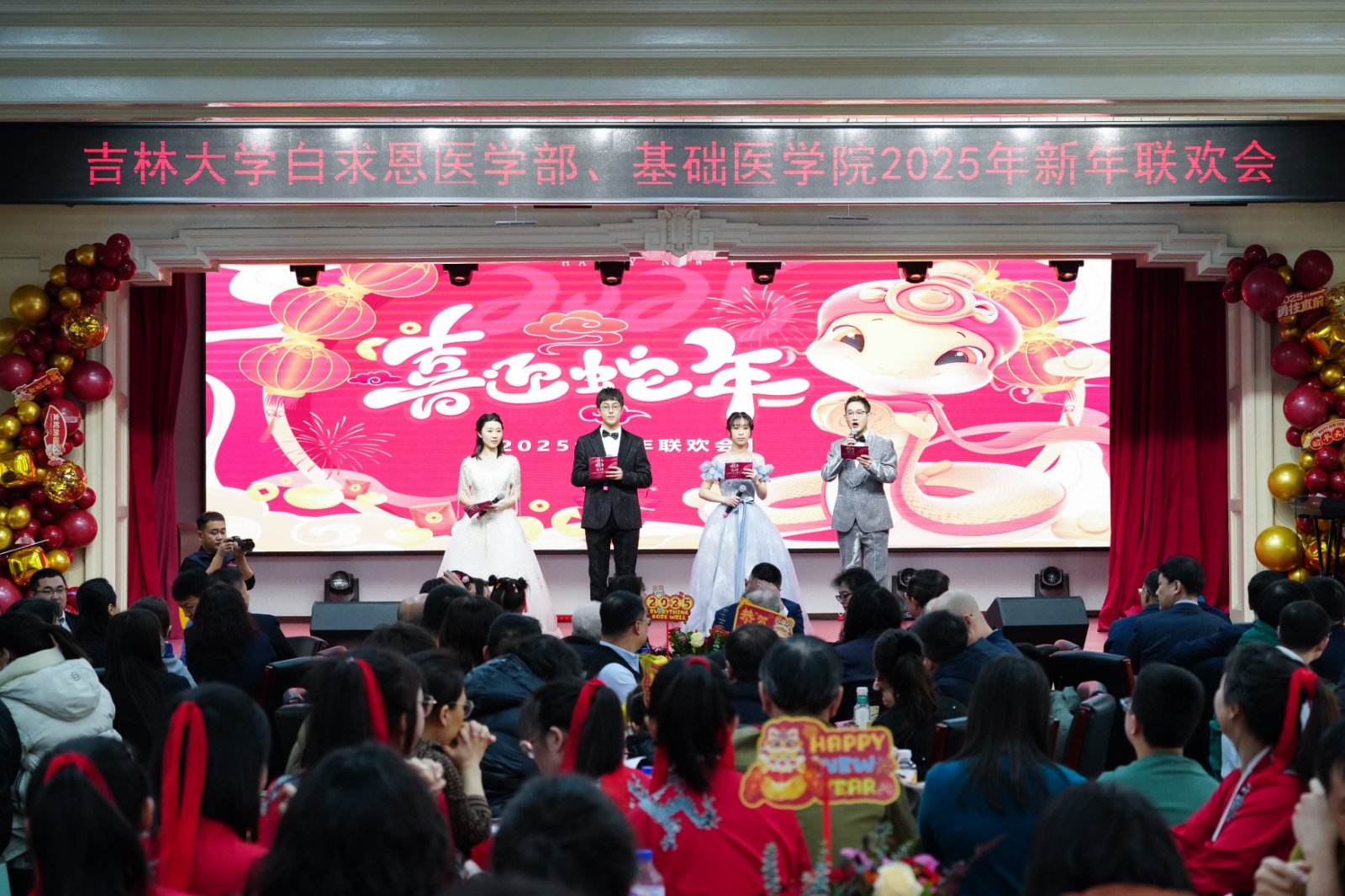 岁序更替,华章日新;祥蛇献瑞,共启新程。2025年1月10日下午,白求恩医学部、基础医学院联合在基础楼二楼报告厅举办2025年新春联欢会,学部及学院现任、历任领导班子成员、部分退休老领导、学院合作单位负责人,师生代表共计二百余人欢聚一堂,共迎新春,欢庆佳节。