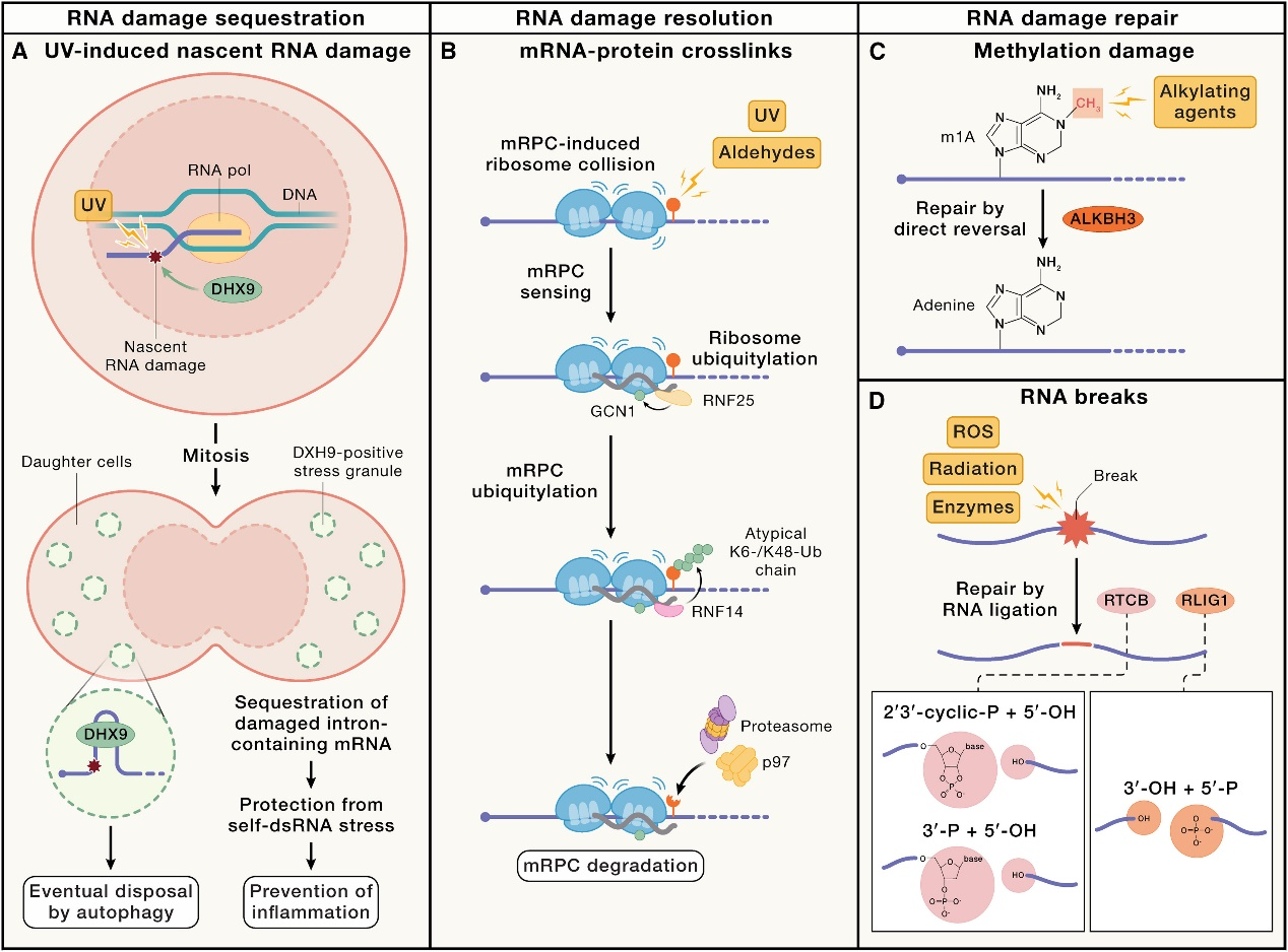 细胞具有多种机制来处理受损的RNA,包括隔离、降解和修复。例如,细胞通过形成DHX9阳性应激颗粒对UV诱导的新生RNA损伤进行隔离,防止细胞质中双链RNA的积累和炎症反应。UV和醛类诱导的mRNA-蛋白交联(mRPCs)通过翻译耦联的方式被识别和降解,涉及RNF25和RNF14等E3泛素连接酶。由烷基化剂引起的RNA甲基化损伤可以被去甲基化酶ALKBH3直接逆转。RNA断裂可以通过特定的RNA连接酶(如RTCB和RLIG1)进行修复(图2)。