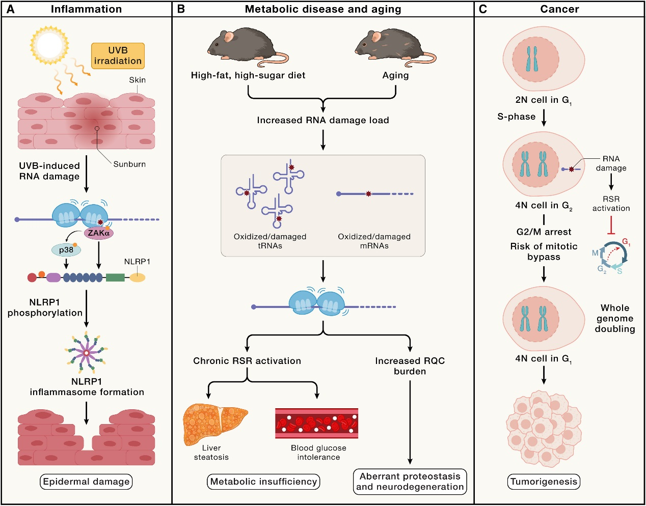 RNA损伤和相关的细胞应激反应与多种人类疾病有关,包括炎症、代谢疾病、神经退行性疾病和癌症。例如,UVB诱导的RNA损伤激活RSR,导致皮肤角质细胞中NLRP1炎症小体的激活,引发炎症信号和细胞死亡。代谢疾病和衰老过程中RNA损伤的增加导致核糖体停滞和RSR的持续激活,可能促进代谢功能障碍和蛋白质稳态失衡。RNA损伤引起的核糖体碰撞导致RSR的持续激活,可能引发细胞周期停滞和全基因组加倍(WGD),与癌症的发生和预后不良相关(图3)。