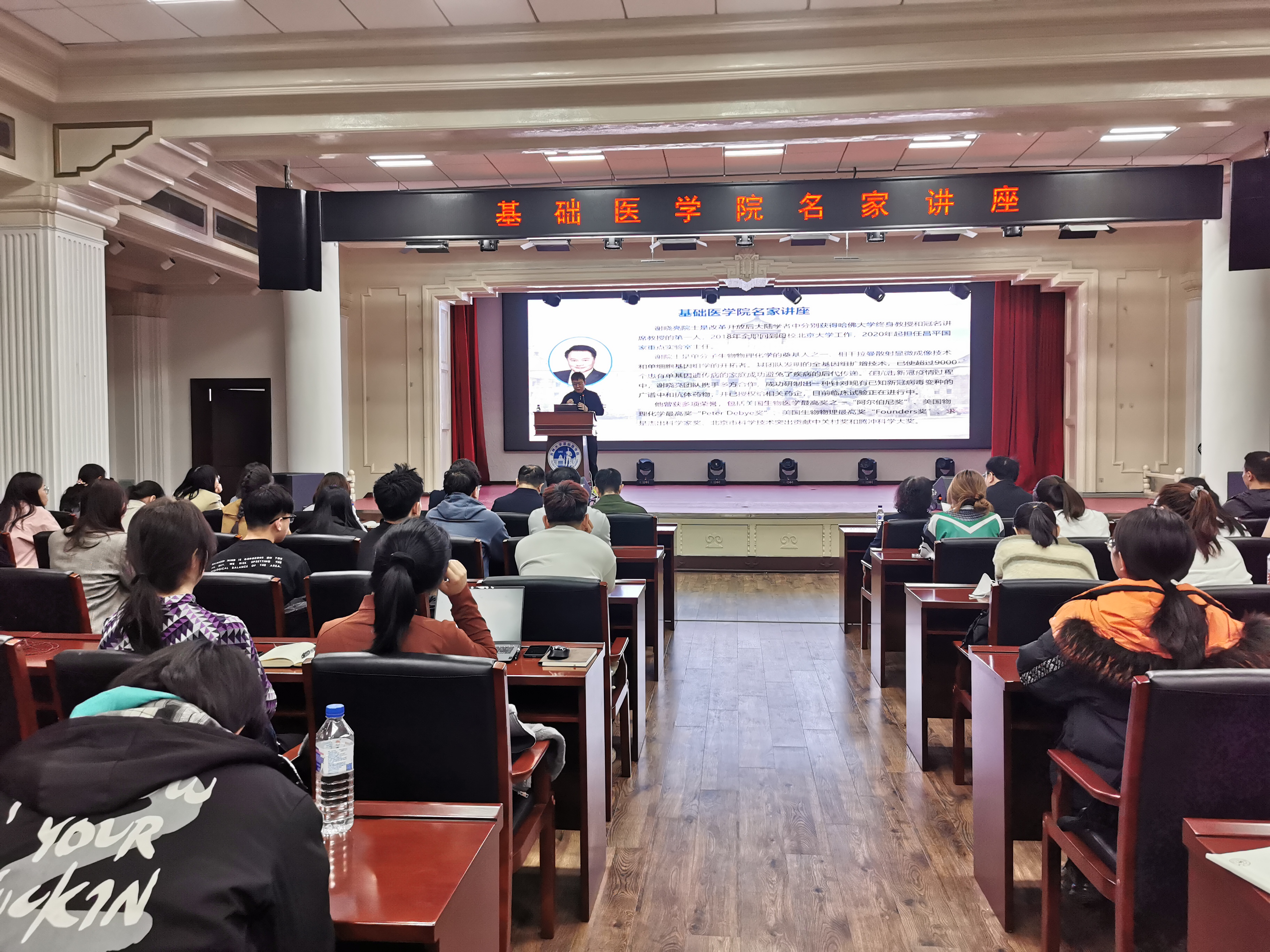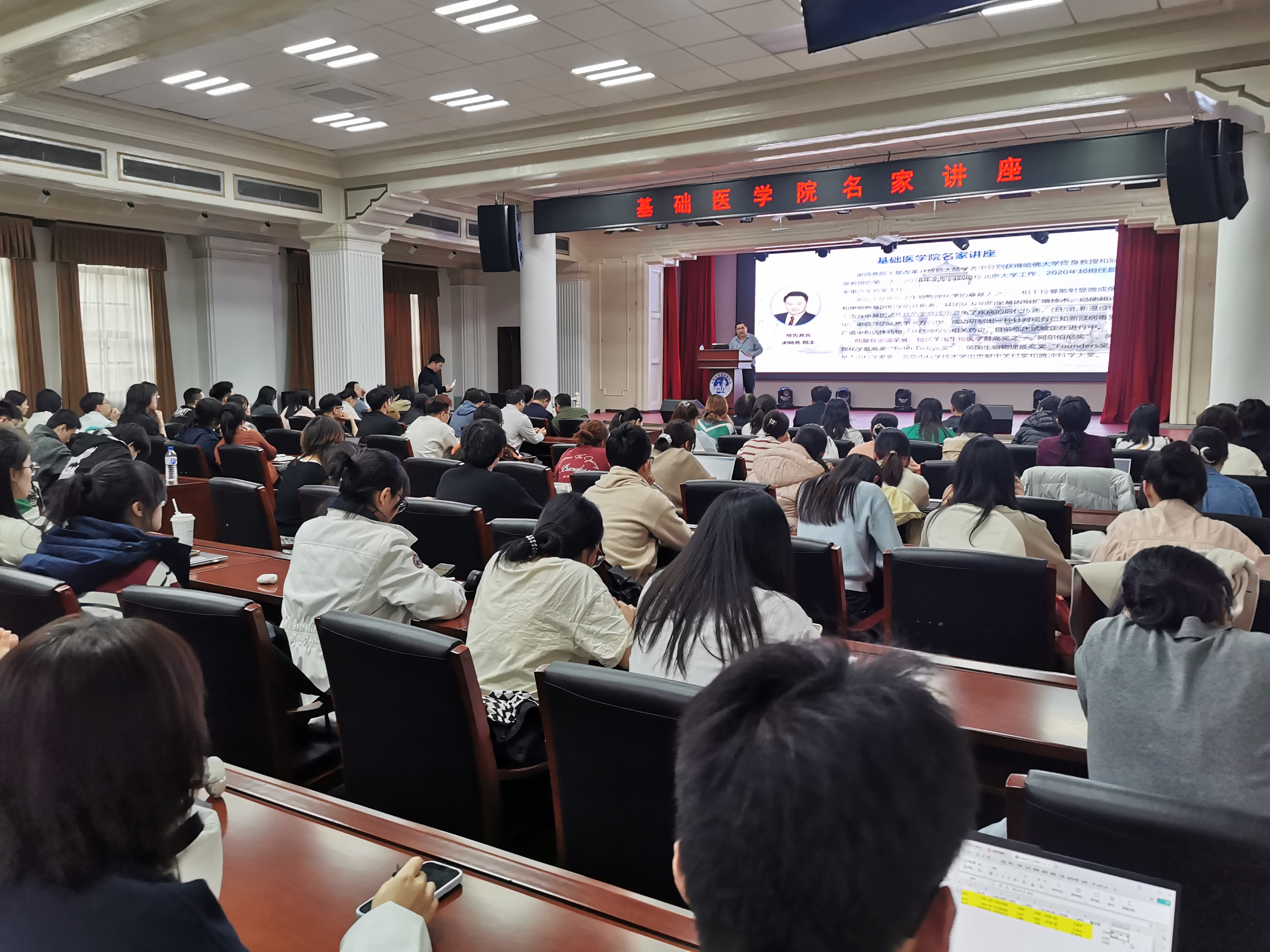 讲座伊始,基础医学院副院长李冬教授代表学院领导班子致欢迎辞。他高度评价了谢晓亮院士在单分子生物物理化学、基因组学等领域的开创性贡献,以及在新冠疫情期间研发广谱中和抗体药物的社会价值。李冬教授表示:“谢院士的学术历程和家国情怀为青年学者树立了标杆,此次讲座将为学院师生提供宝贵的学术启迪。”