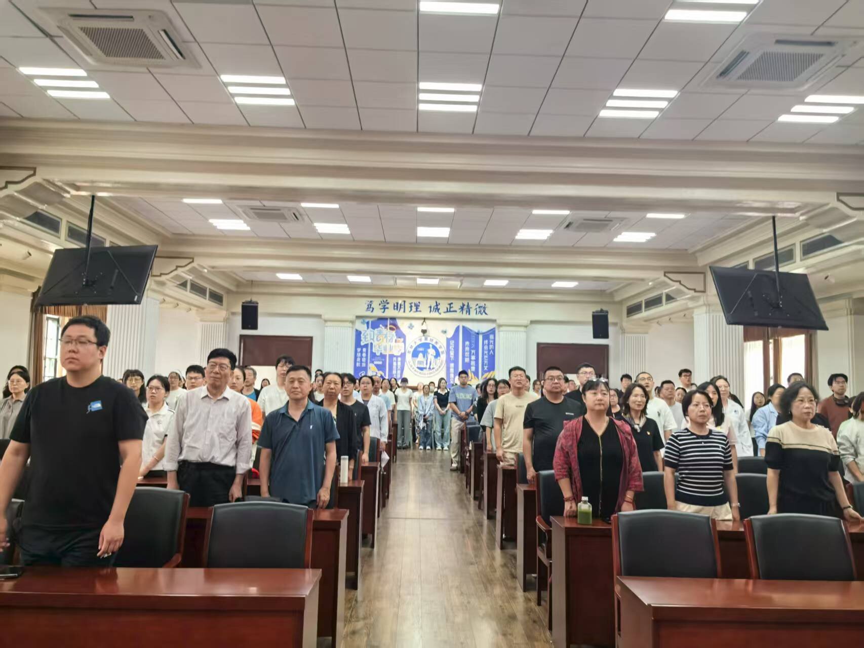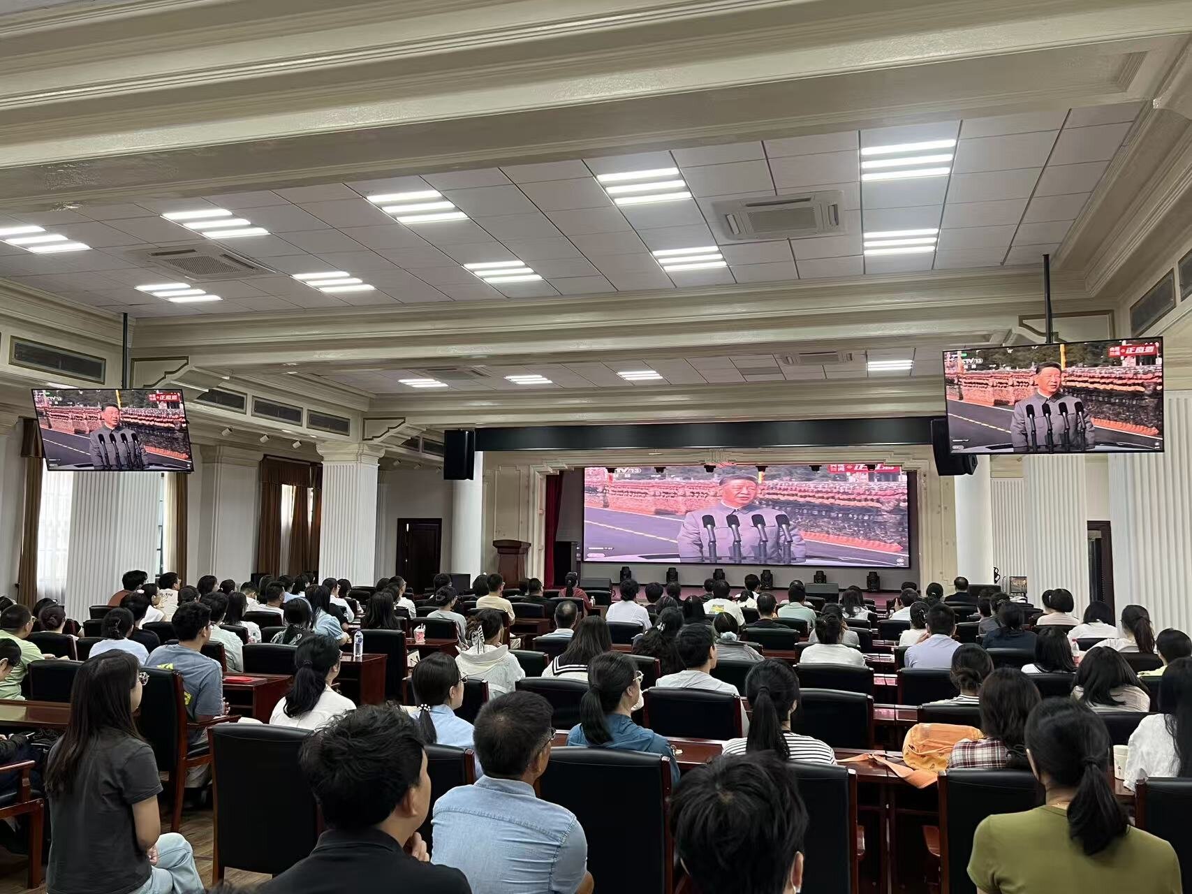 2025年9月3日上午,基础医学院党委组织全院200余名师生在二楼报告厅集体观看纪念中国人民抗日战争暨世界反法西斯战争胜利80周年大会及阅兵式,共同铭记历史、缅怀先烈、珍爱和平、开创未来。