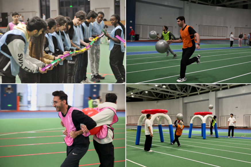 随后进行的积分赛环节将活动推向高潮。“珠行千里”——队员们将各自的半圆形球槽相连,将球连续传动到下一个队员的球槽中,到达指定的小桶内;“背夹球接力”——每两位队员背对背夹住球,小跑通过终点,将球交给下一对队友,依次接力;“超级投篮”——每位队员手持瑜伽球从起点出发,运球抵达标志桶后将球投入充气篮筐,投中后立即返回起点,将球交给下一位队友接力。场上口号此起彼伏,场边加油呐喊不断。各队成员齐心协力、默契配合,同学们在失败中汲取经验教训,不断调整和完善自己的方式和方法,展现出良好的团队协作精神和昂扬的竞技状态。