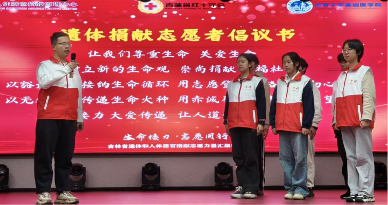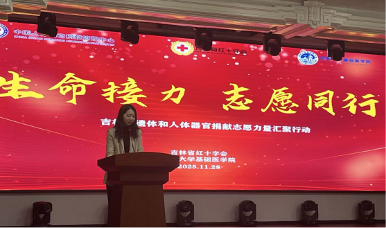 活动伊始,主持人吉林大学基础医学院团委书记孙佳钰代表学院,向莅临现场的吉林省红十字会捐献服务中心主任刘艳丽、学院人体解剖学系实验室主任赵航等领导嘉宾致以热烈欢迎,向踊跃参与的志愿者同学们们表达诚挚谢意。随后,刘艳丽主任发表致辞,详细阐述了遗体与人体器官捐献的公益价值,介绍了相关政策支持与保障体系。她表示,吉林省红十字会将续深耕公益领域,以专业服务为遗体和人体器官捐献事业保驾护航,让大爱之举惠及更多家庭。