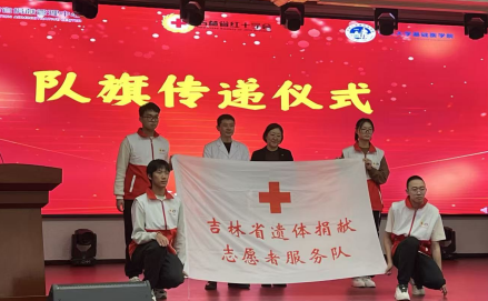 在志愿者纳新环节,志愿者代表宣读《遗体捐献志愿者倡议书》,字里行间传递着对生命的敬畏与公益担当。现场志愿者共同宣誓《红十字志愿者誓词》,铿锵誓言彰显着投身生命接力事业的坚定决心。随后的队旗传递仪式上,刘艳丽主任与赵航主任共同向志愿者代表传递队旗,象征着责任的传承与使命的延续,标志着吉林省遗体捐献志愿者服务队的志愿力量再次壮大。