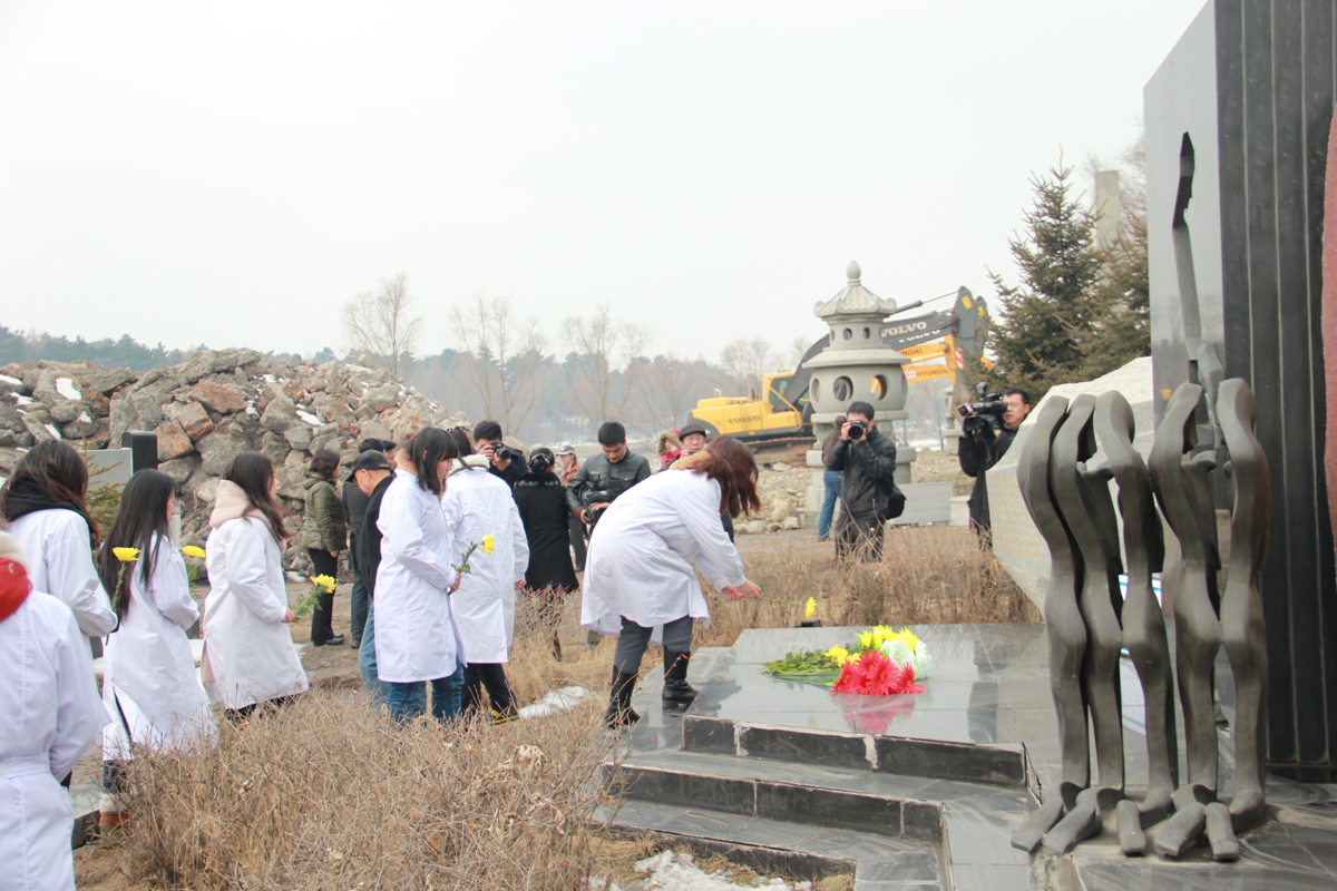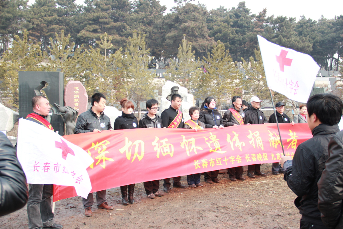 在清明节来临之际,为了缅怀遗体捐献者,弘扬人道、博爱、奉献的红十字精神,吉林大学白求恩医学院与长春市红十字会、长春晚报、九龙源社会公墓等单位一道在九龙源社会公墓纪念碑联合举办了“大爱无声,精神永存”的悼念活动。长春市红十字会常务副会长王大雷、《长春晚报》副总编刘立志、新闻部主任刘连宇、九龙源社会公墓经理张仁贵、副经理肖宝娟、白求恩医学院副院长陈霞、辅导员秦雪参加了此次活动。参加活动的还有遗体捐献志愿者、遗体捐献者亲属、九龙源社会公墓工作人员以及白求恩医学院40名学生党员。本次活动由市红十字会秘书长李锋华主持。
