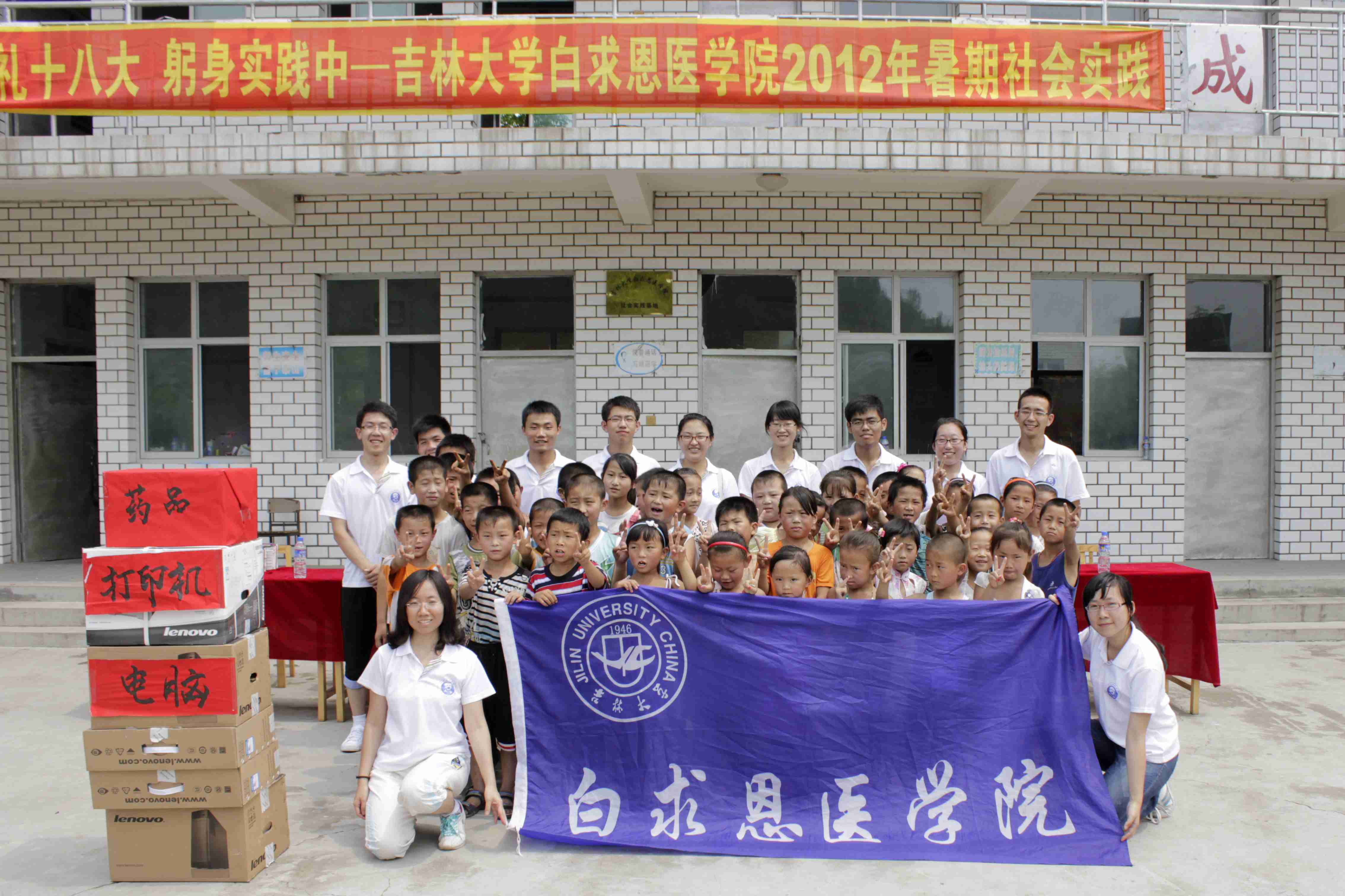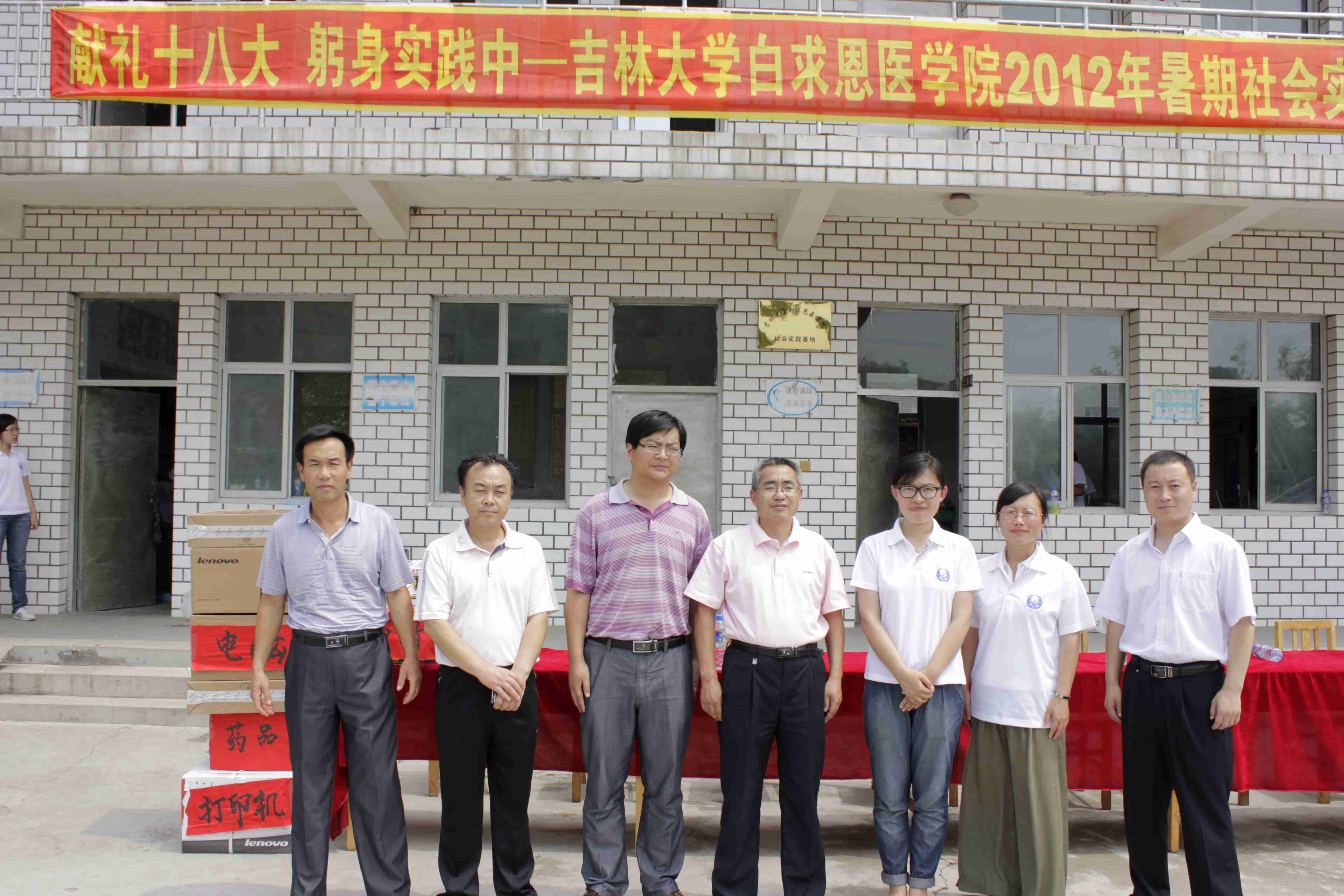 上午,爱心物品捐赠仪式正式开始。唐县团委及教育局的领导,白求恩医学院社会实践小分队带队教师魏宇航,指导教师孙娇出席了仪式,社会实践小分队全体队员和所有孩子们也列队参加了仪式。队员李腾海担任主持人。首先,赵狄、张颖异代表社会实践小分队与唐县领导进行了物品交接,包括白求恩医学院“爱心一元捐”募集的资金购置的打印机、中宏人寿保险有限公司捐赠的电脑和书籍以及由吉林省慈善总会捐赠的药品。接下来,唐县团委副书记曹庆伟发言,他对社会实践小分队的到来表示欢迎,并希望小分队能够把这里的白求恩精神带回学院,带给更多的白医学子。随后,唐县教育局办公室主任史耀东发言,他告诉孩子们要心存感恩,努力学习,走出大山,成为真正对社会有用的人才。最后,由本次社会实践小分队带队教师魏宇航进行发言,首先她代表白求恩医学院对所有关心和支持学生社会实践的领导和乡亲们表示感谢,同时肯定了四年来河北唐县社会实践对学生成长的巨大作用,尤其是在这里成立白求恩医学院社会实践基地以来,一批又一批的队员们来到这里,接受白求恩精神的洗礼,并在日后的学习和工作中努力践行白求恩精神。魏宇航还表示此项社会实践会长期坚持下去,以更好地教育学生,引导学生,使他们真正的成为白求恩式的医务工作者,报效祖国,回馈社会。