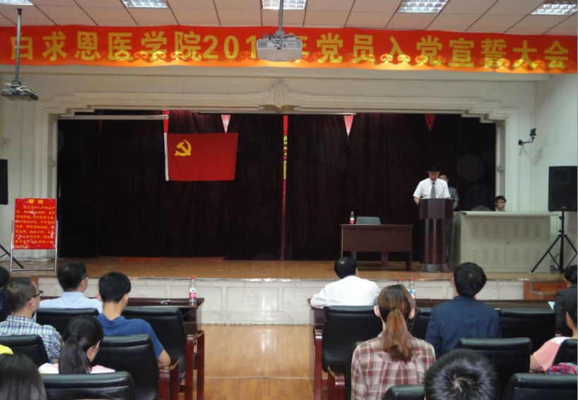 6月15日晚,白求恩医学院2012年党员入党宣誓大会在吉林大学新民校区基础楼二楼多功能学术报告厅举行。白求恩医学院党委书记屈英和、党委副书记费淑波、部分老师和全体党员、预备党员参加了本次大会,大会由学院党委副书记兼副院长苑锐主持。
