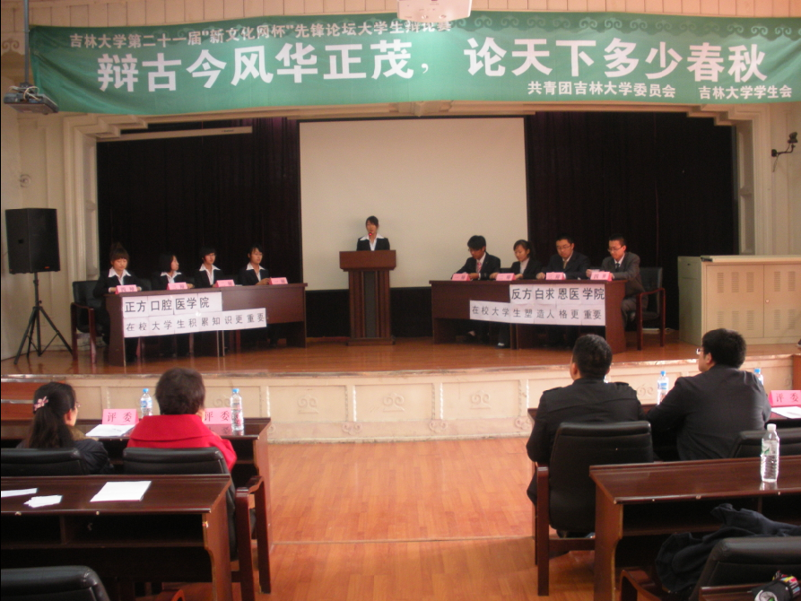 10月29日上午,吉林大学第二十一届“新文化网杯”先锋论坛大学生辩论赛初赛在基础楼二楼多功能学术报告厅举行。本场辩论赛的正反方分别为白求恩医学院代表队与口腔医学院代表队。双方就“在校大学生应注重积累知识还是塑造人格”展开了激烈的辩论。