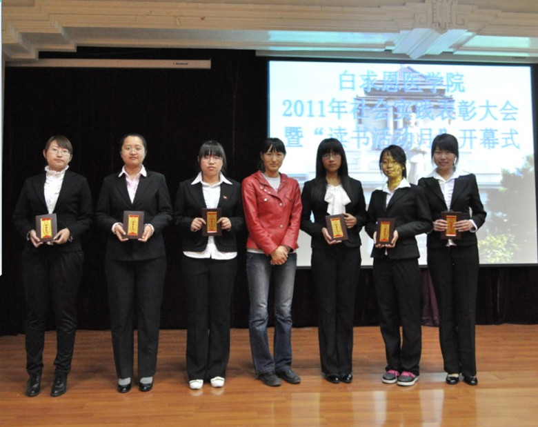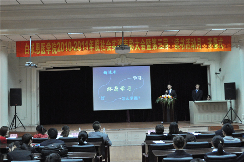 首先,团委第一副书记李梓萌做2011年暑期社会实践活动总结,团委第二副书记单锐婷对2011年暑期居民健康档案问卷调查从数据分析、存在问题及评价与意义等三方面做了报告。大会共评选出社会实践先进个人25名,优秀个人54名,优秀社会实践报告59篇,优秀团队9个,优秀组织两个、先进团队4个。会上,张志博、赵晨宇、莫雪、张享等同学分别上台代表先进个人、优秀社会实践报告、先进团队及优秀组织获奖者做汇报。人体解剖学系副教授刘海岩因在担任唐县社会实践小分队指导教师期间的突出表现被授予社会实践特别贡献奖,他表示很荣幸获得此项荣誉,并鼓励同学们积极参加社会实践。最后,由校团委志工部部长张尧老师讲话,她首先肯定了白求恩医学院在社会实践活动中取得的成绩,表达了对同学们的殷切期望,希望同学们在奉献中体会爱与责任,在实践中领悟意义与价值。随后,学生会主席高宪做“读书活动月”动员发言,希望全院同学积极参加此次活动。(学生记者 崔梦钊)