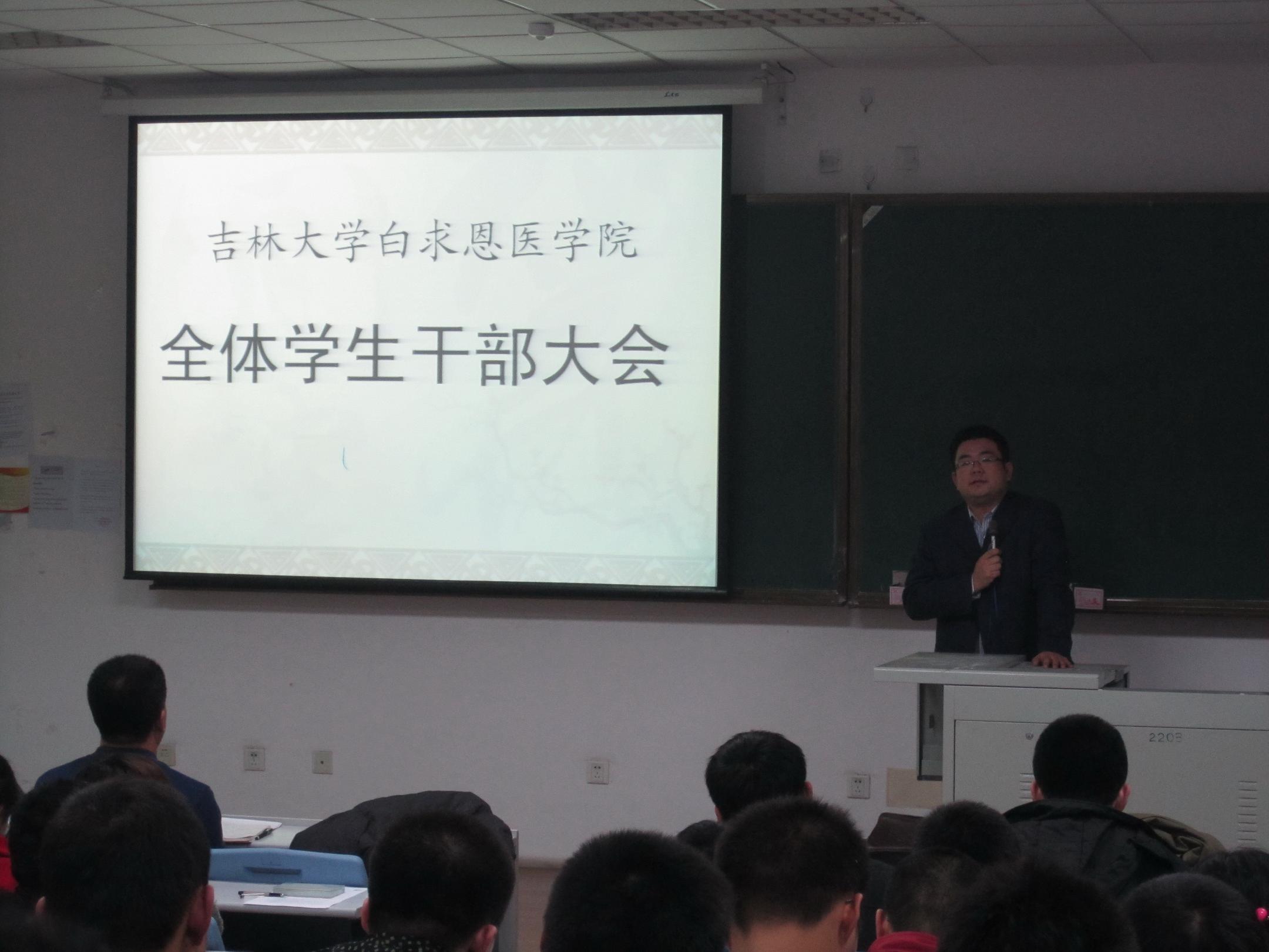 3月17日,白求恩医学院在新民校区第二教学楼2203教室召开了学生干部大会,部署本学期工作。学院团委、学生会部长级以上干部、各年级长、团总支书记、班长、团支部书记参加了会议,学院党委副书记兼副院长苑锐及全体辅导员老师出席了大会。会议由院学生会秘书长崔梦莹主持。