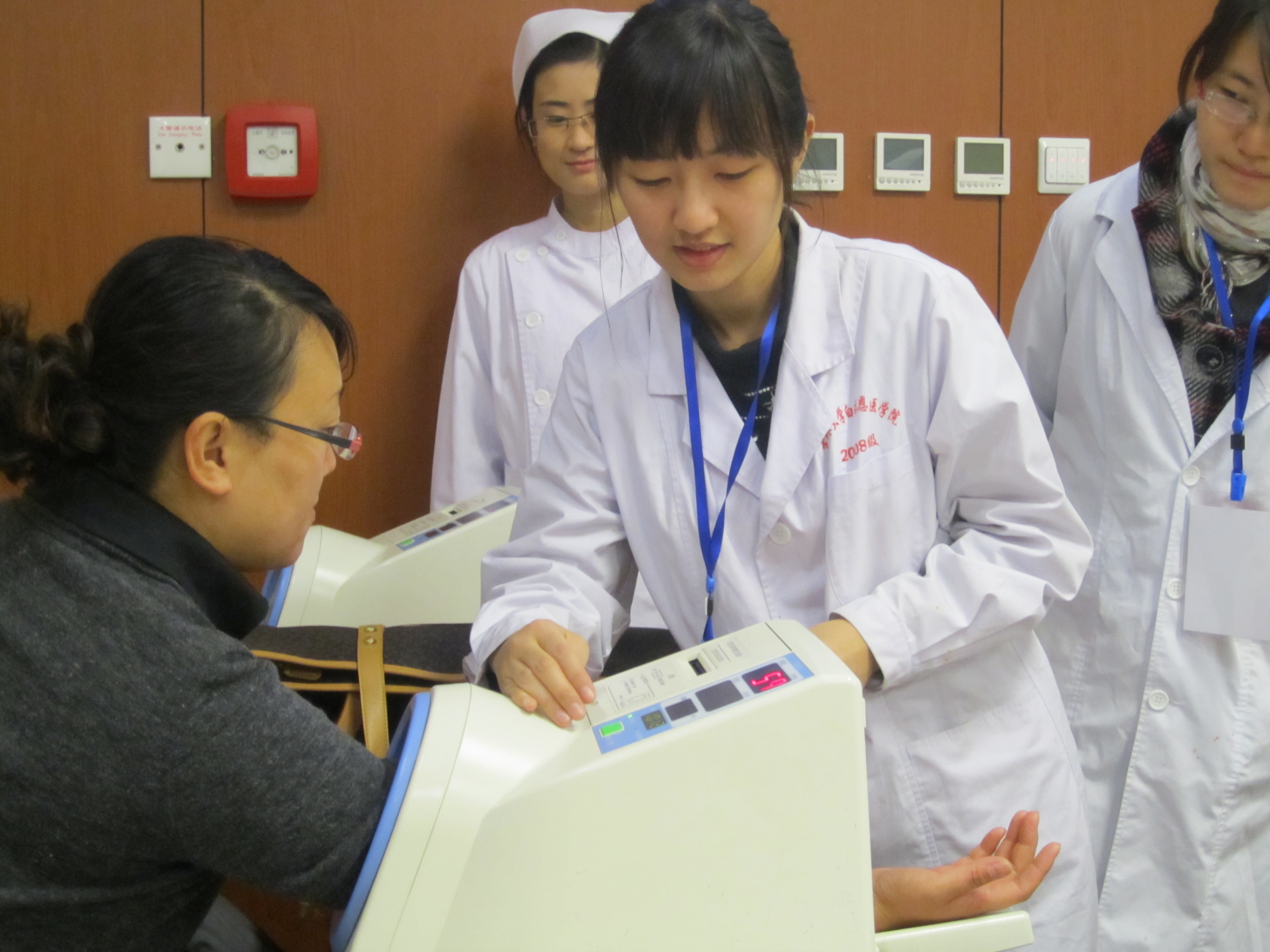 在接受了岗前培训后,志愿者分别走上各自的岗位开始了短暂的导诊和分诊工作——为患者指路、解答挂号方面的疑问、帮患者量血压等,志愿者们不但把在课堂上学到的知识充分的应用到了实践中,大部分志愿者还在医院工作人员的细致讲解下,学会了如何使用相关的医疗器械,为今后从事医疗事业积淀了一定的基础。
