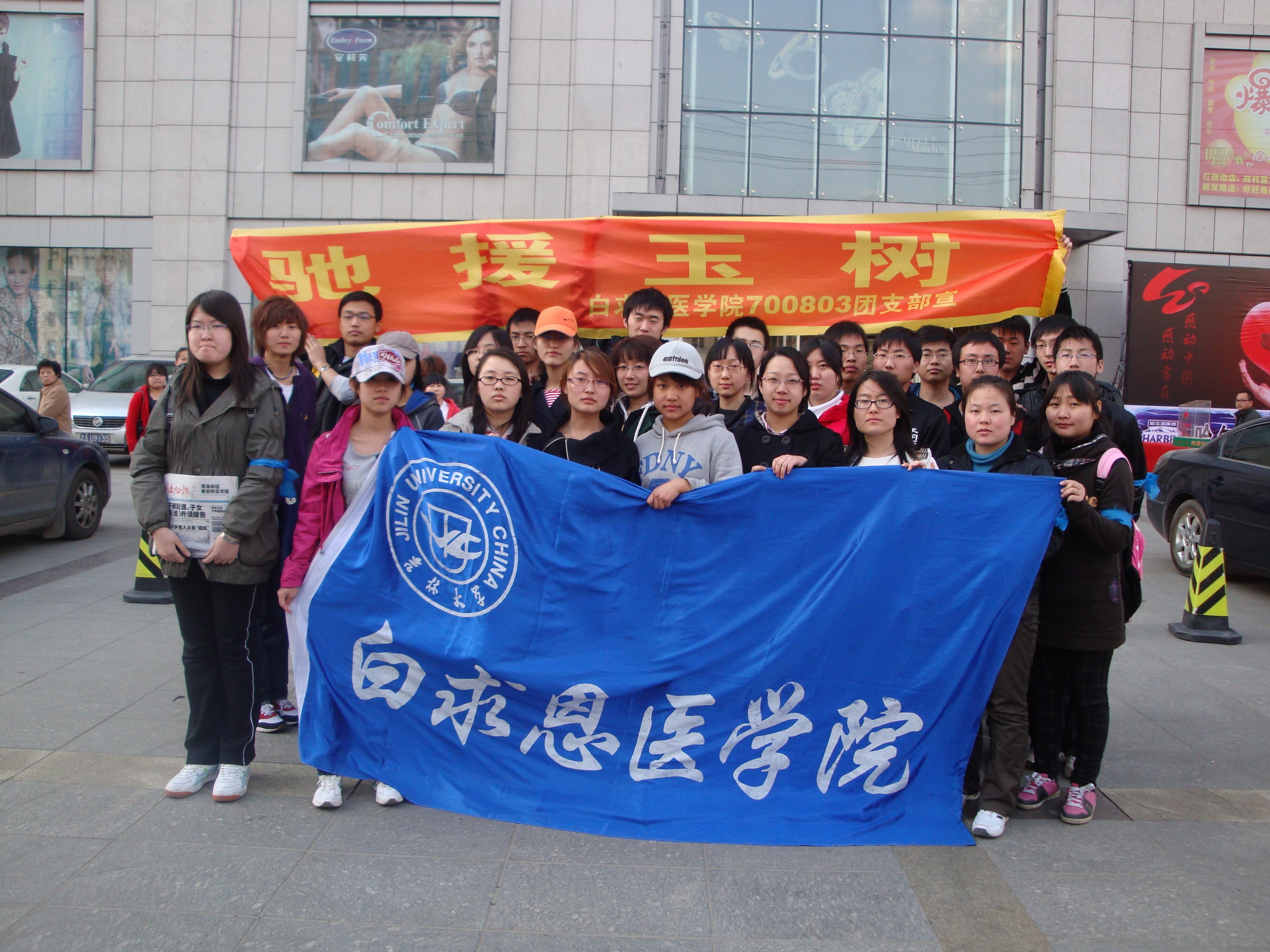24日,白求恩医学院700803团支部组织了“云水遥”爱心义卖的第二次活动。本次义卖活动的主题是“守望西南,驰援玉树”。活动于中午12点30分开始,全班同学开始在红旗街分组进行义卖。同学们吃苦耐劳、无私奉献的精神打动了路过的市民,市民纷纷伸出援手,短短的四个小时,700803团支部共募集到善款1700余元,加上第一期活动所筹得的善款,两次共募集善款3900余元。