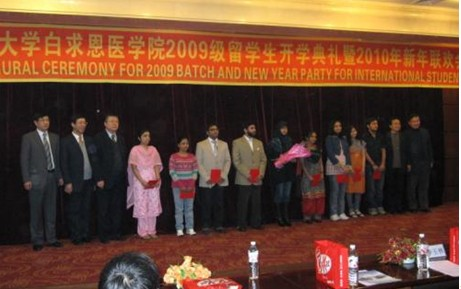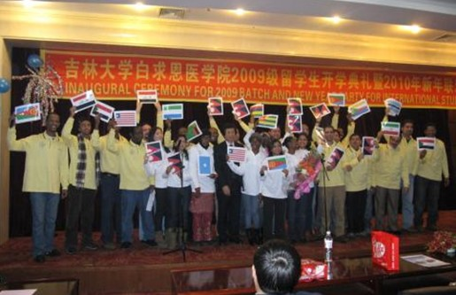 12月31日下午,我院全体留学生与各级领导、老师和关注留学生教育事业发展的同仁们欢聚一堂,举行吉林大学白求恩医学院2009级留学生开学典礼暨2010年新年联欢会,常务副校长兼白求恩医学院院长李玉林出席典礼并观看联欢演出。