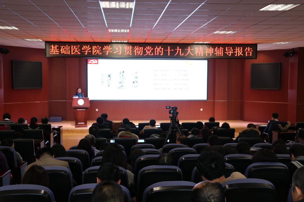 12月7日上午,基础医学院党委在新民教学楼一教401召开学习贯彻十九大精神的辅导报告会。报告会由学院党委书记郑爽主讲,院长孙连坤主持,学院全体教职工参加了报告会。