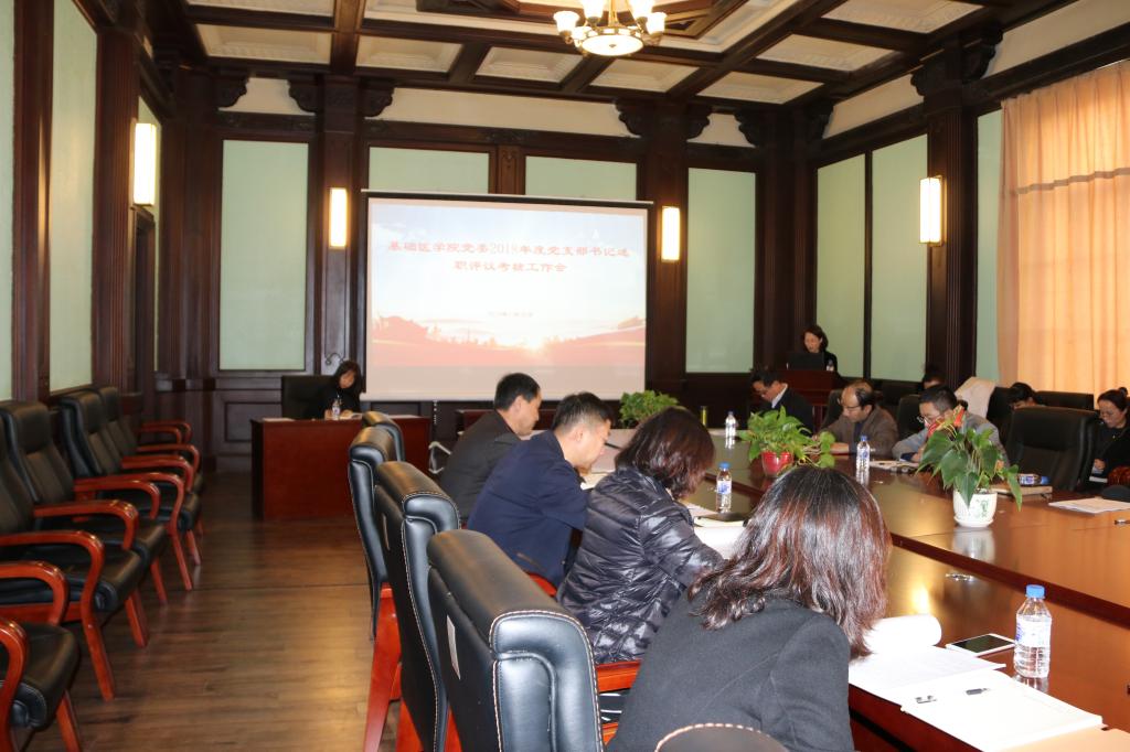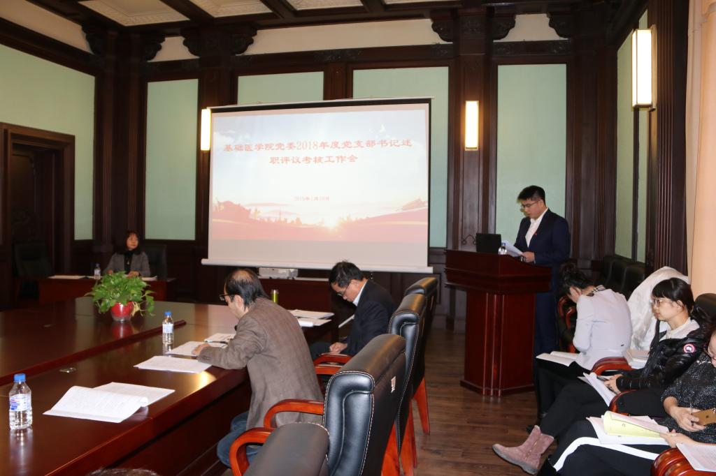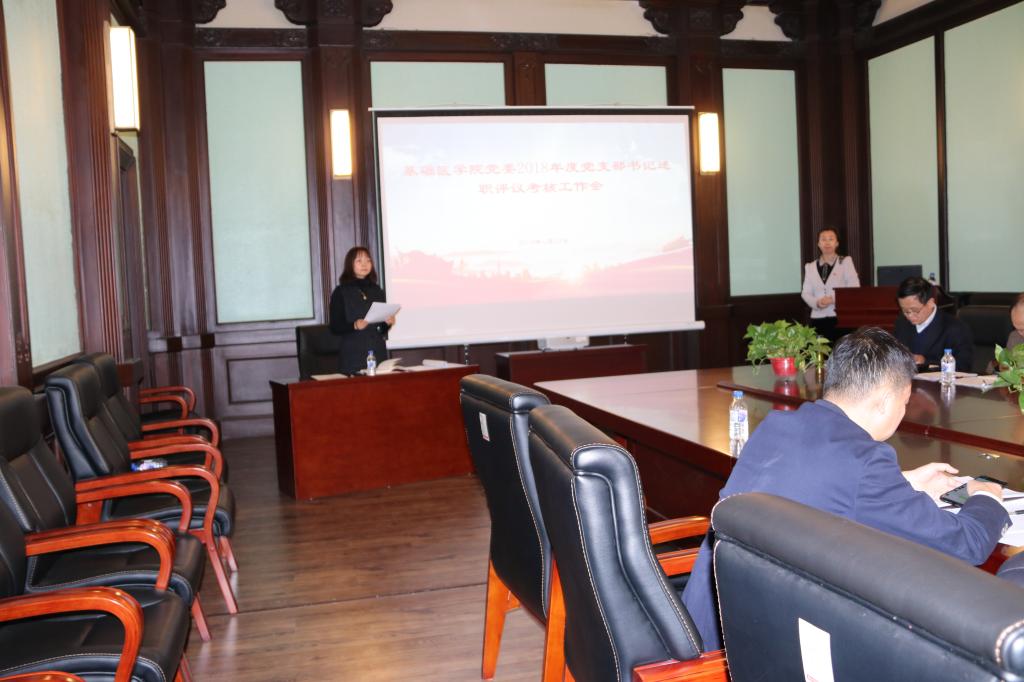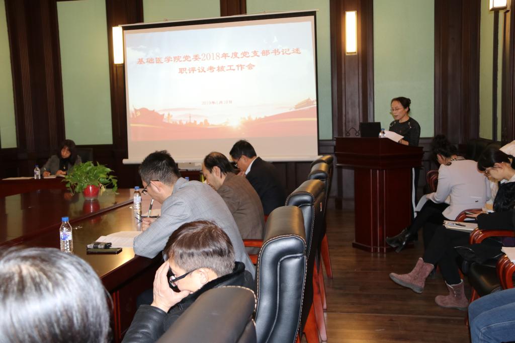1月10日,基础医学院党委在基础四楼会议室召开了2018年度党支部书记述职评议考核工作会。学院党委委员、纪委委员、行政领导班子成员、党支部书记、党办主任参加了会议,同时邀请了党员代表及各科室、教研室、学系及中心主任参会。会议由学院党委书记郑爽主持。