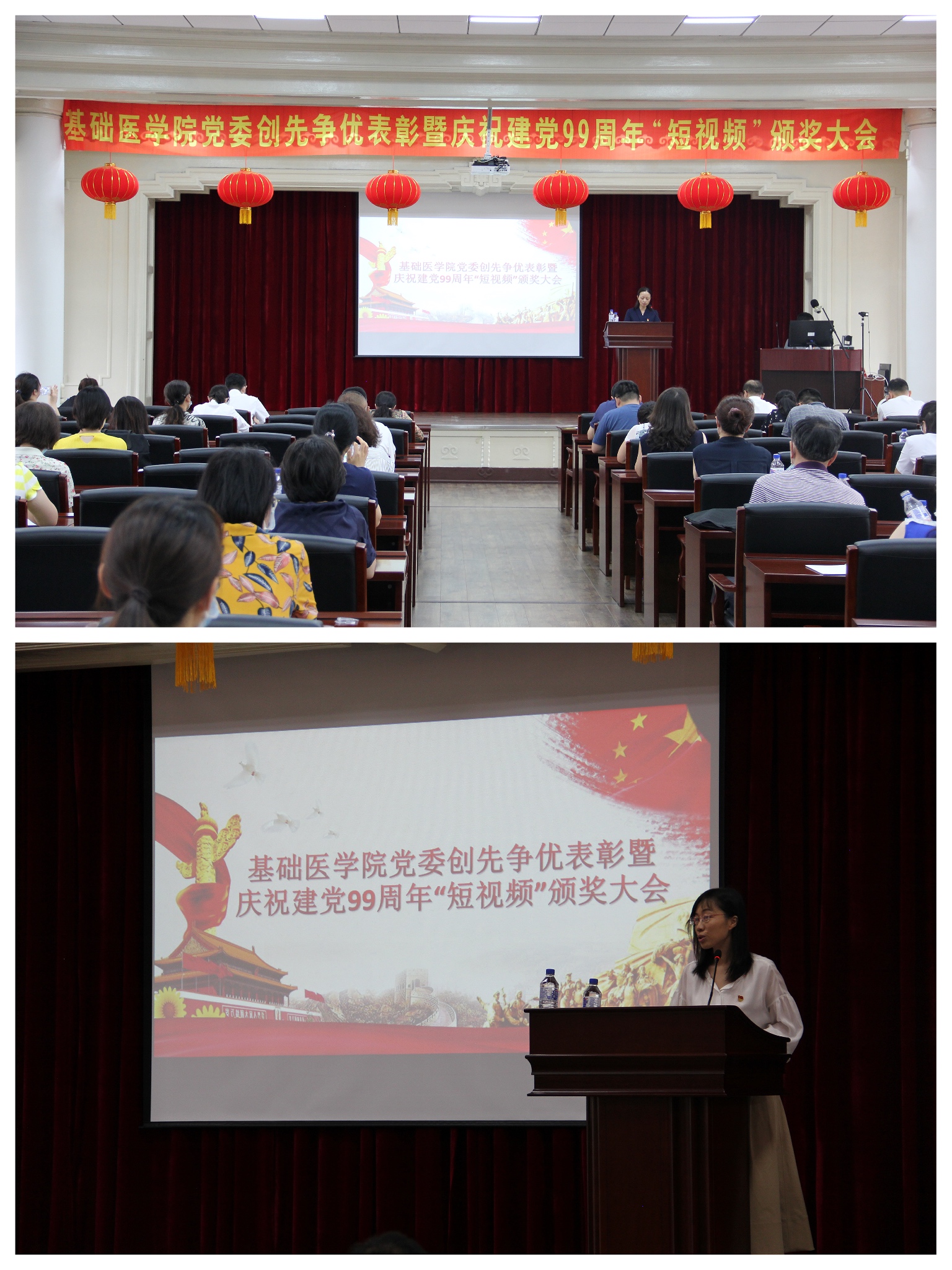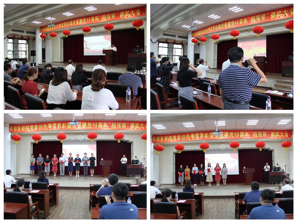 在纪念建党99周年之际,为了深入学习贯彻党的十九届四中全会精神,巩固深化“不忘初心、牢记使命”主题教育成果,激励党支部履职尽责创先进、引导广大党员立足岗位争优秀,切实把党支部、党员的智慧、力量凝聚到学院建设、创新发展上来,同时为进一步激发学院党支部活力,增强广大党员的光荣感、使命感,引导师生员工继承和发扬党的光荣传统,凝练、继承、弘扬黄大年精神,7月3日下午,基础医学院党委举办了创先争优表彰暨庆祝建党99周年“短视频”颁奖大会。学院全体教职工党员、民主党派代表,并邀请民主党派代表、非党员学系(教研室、中心)主任参加了大会。会议由学院院长孙连坤主持。