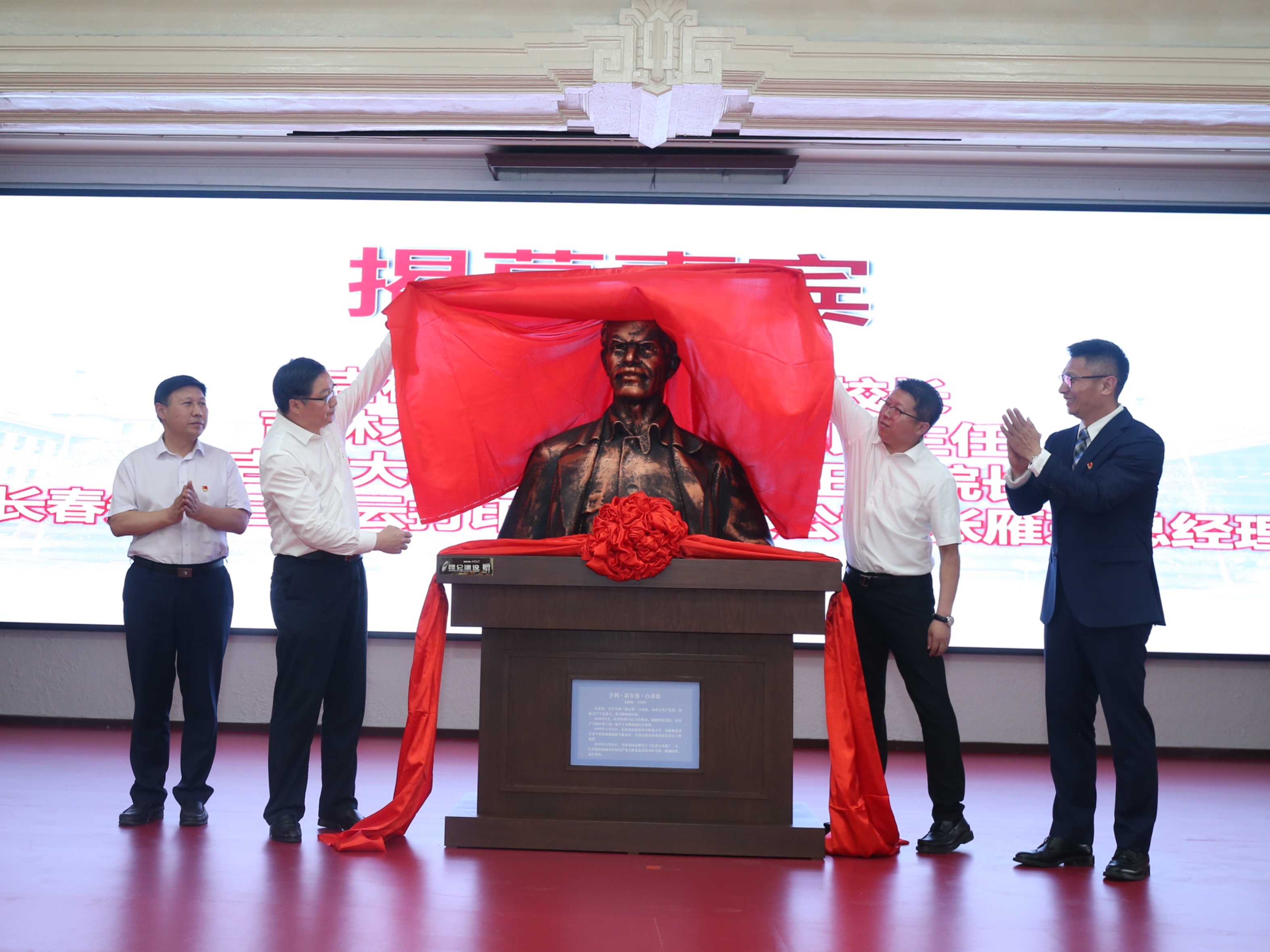 2021年是 “白求恩精神”诞生82年,也是基础医学院建院70周年,在全校深入开展党史学习教育活动之际,为白求恩塑像揭幕有着新的重要意义。本次揭幕的白求恩半身像,以基础医学院院内的汉白玉白求恩塑像为蓝本,经由3D打印全貌复原,并放置在学院二楼,供师生参观学习。该塑像1976年由河北石家庄白求恩国际和平医院赠送给原白求恩医科大学,成为原白求恩医科大学、现在吉林大学医学学科的一个重要的文化符号。揭幕仪式上播放了学院制作的献礼中国共产党建党100周年纪录片《砥砺奋斗 与白求恩同行》,该片高度概括和展现了70年来一代代基础人传承弘扬白求恩精神的鲜活事例,效果极为震撼。在隆重热烈的气氛中,赵国庆副校长、迟宪良处长、王放院长和张雁东经理一起为白求恩塑像揭幕。