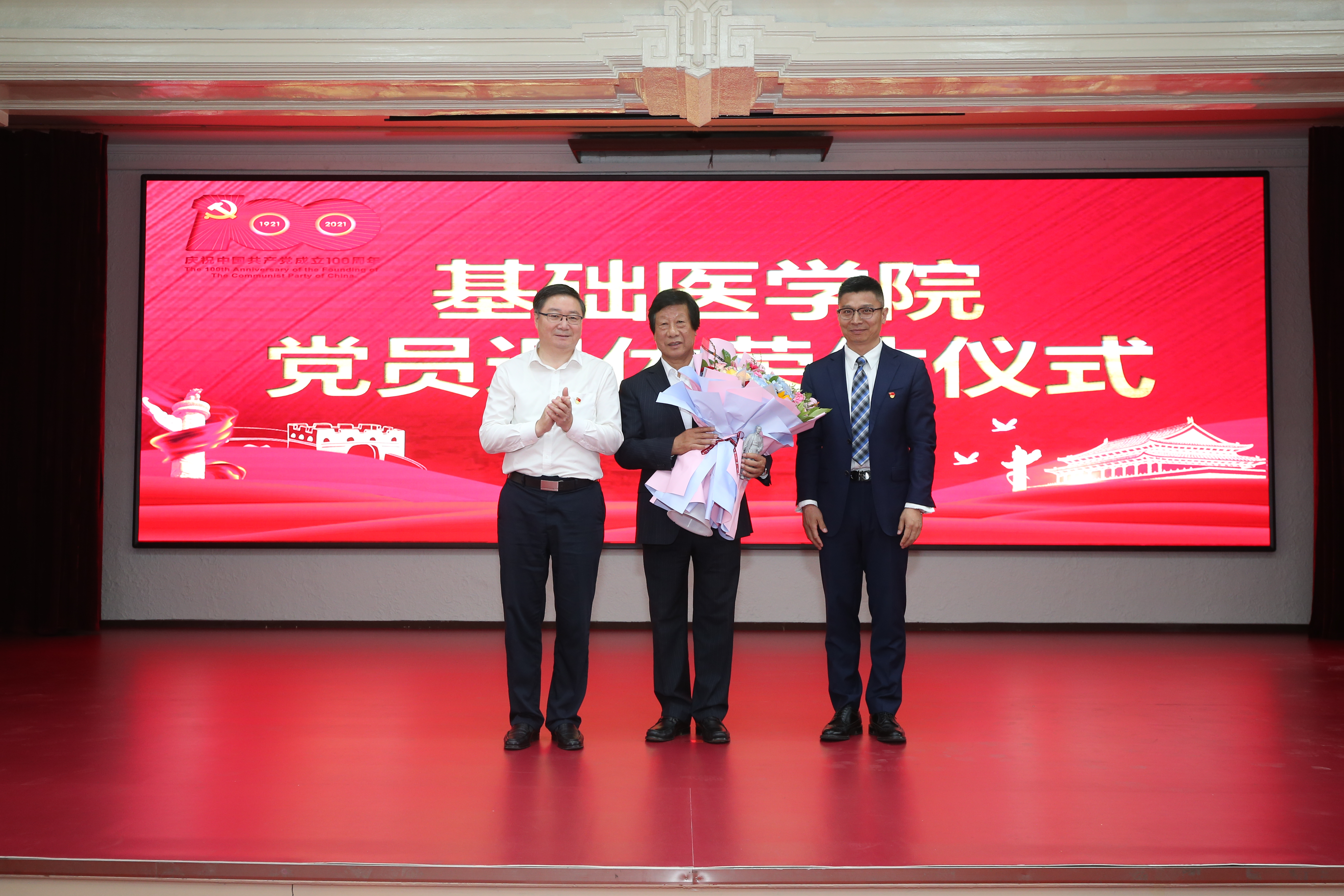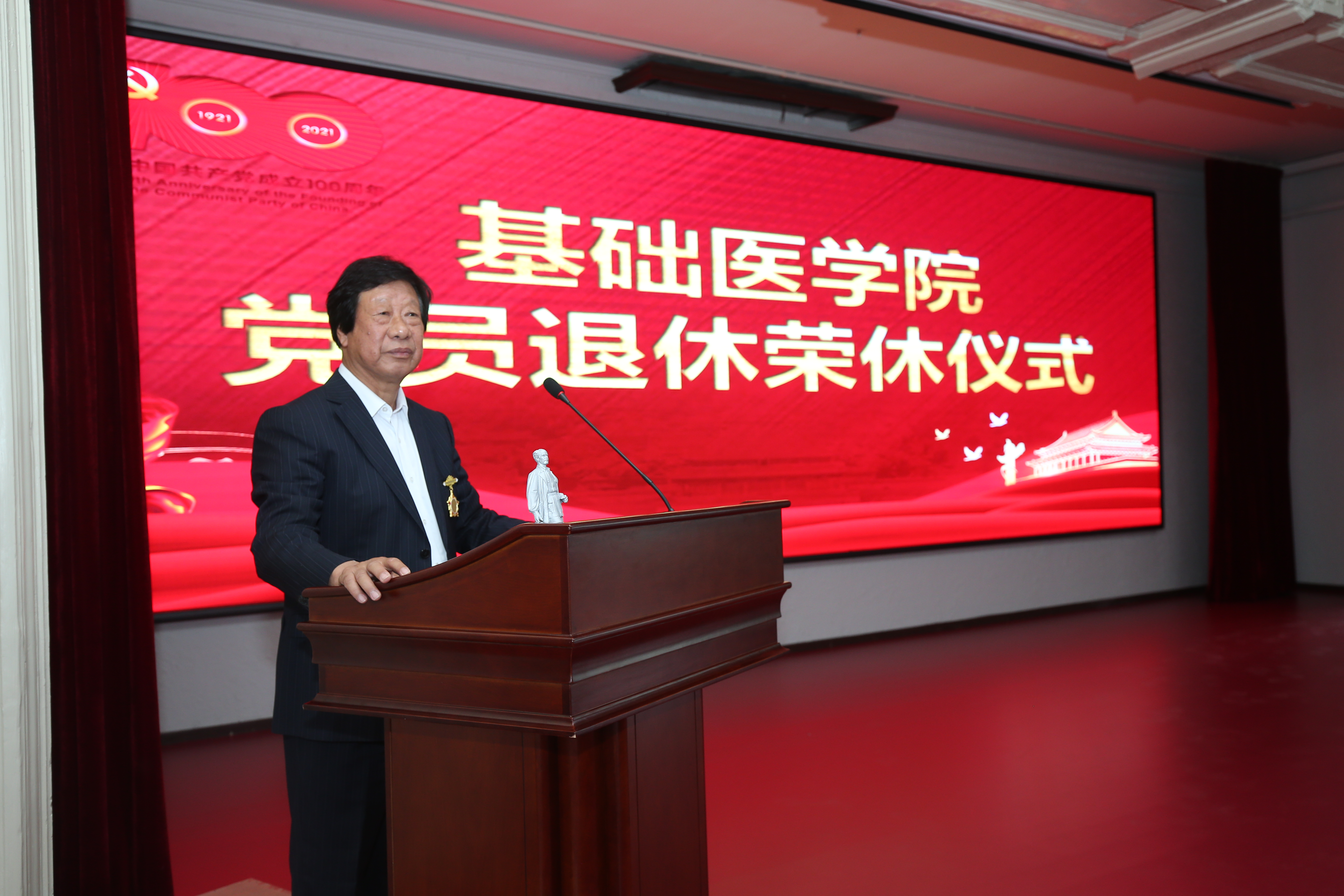 随后进行了基础医学院首次党员退休荣休仪式。王晓荣书记介绍了2021年退休的李玉林、李一、王琳三位党员教授的基本情况,李玉林教授参加工作52年、党龄49年,李一教授和王琳教授党龄34年,赵国庆副校长为退休党员代表李玉林教授颁发纪念章和3D打印的同版白求恩小塑像,王放院长代表学院赠送了鲜花。李玉林教授在发言中讲到自己从一名知识青年到教授、博士生导师的奋斗经历,表达了热爱党和国家、热爱学校、热爱学院、热爱病理学科的真挚情感,展现了一名老共产党员的精神风范,得到现场师生的热烈掌声。