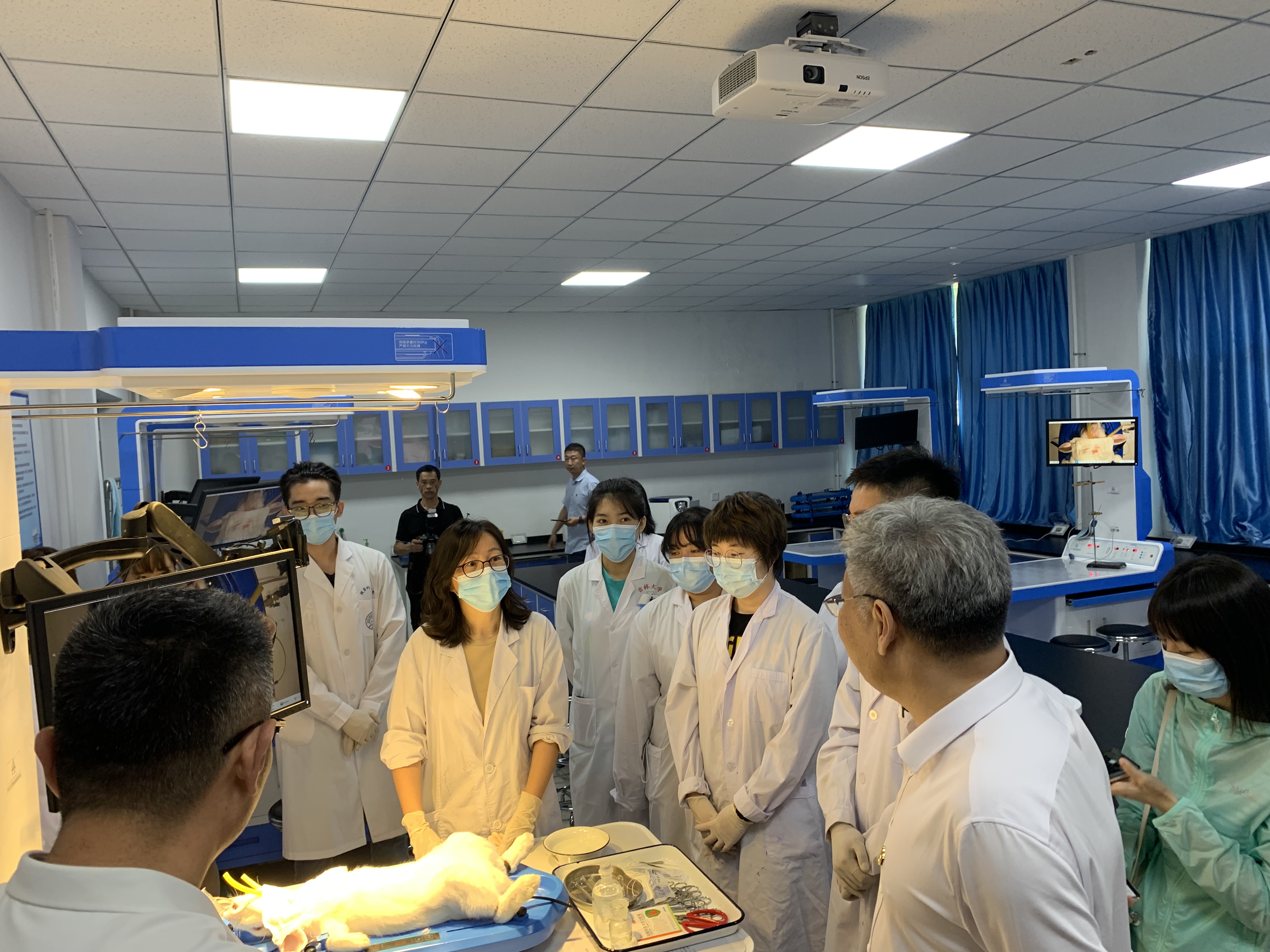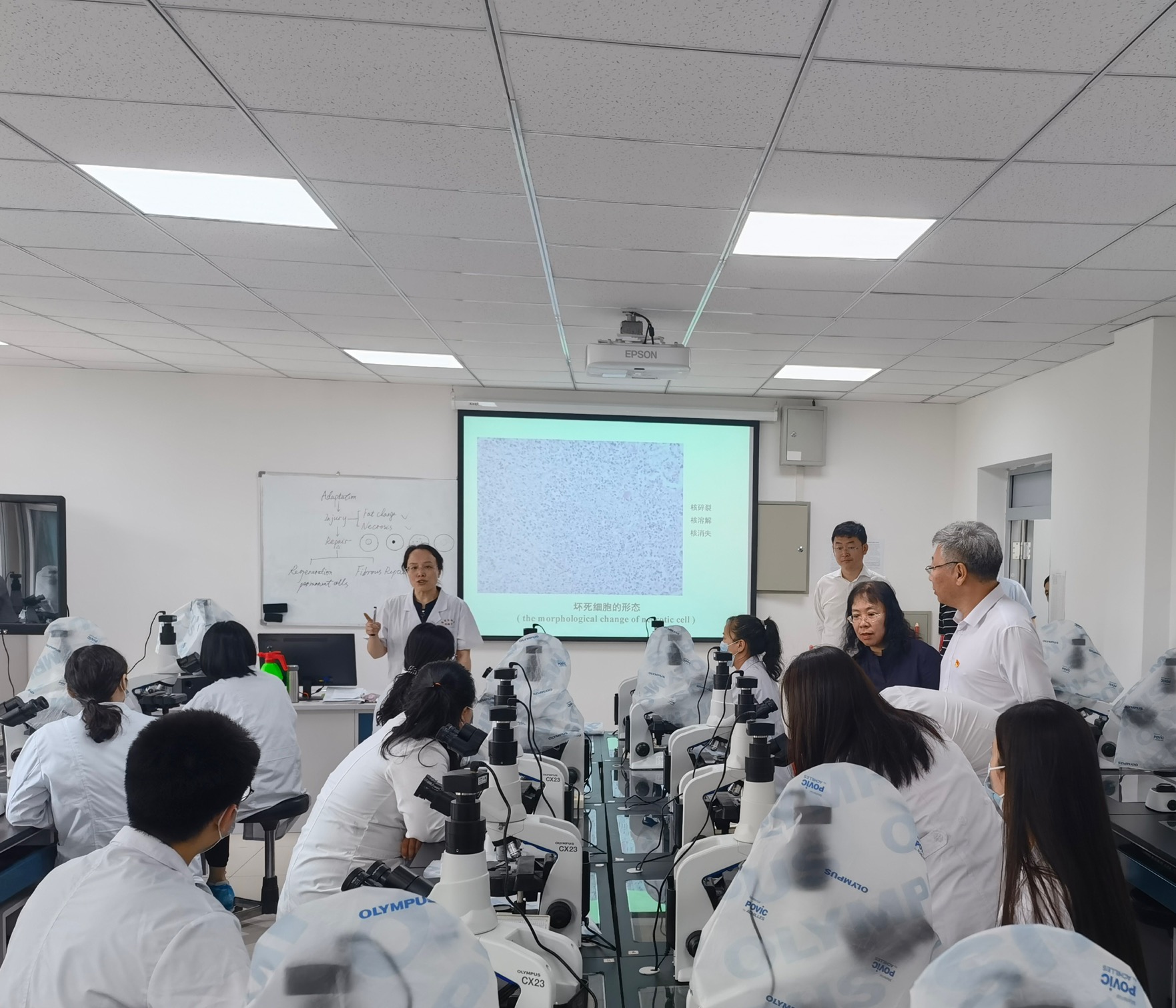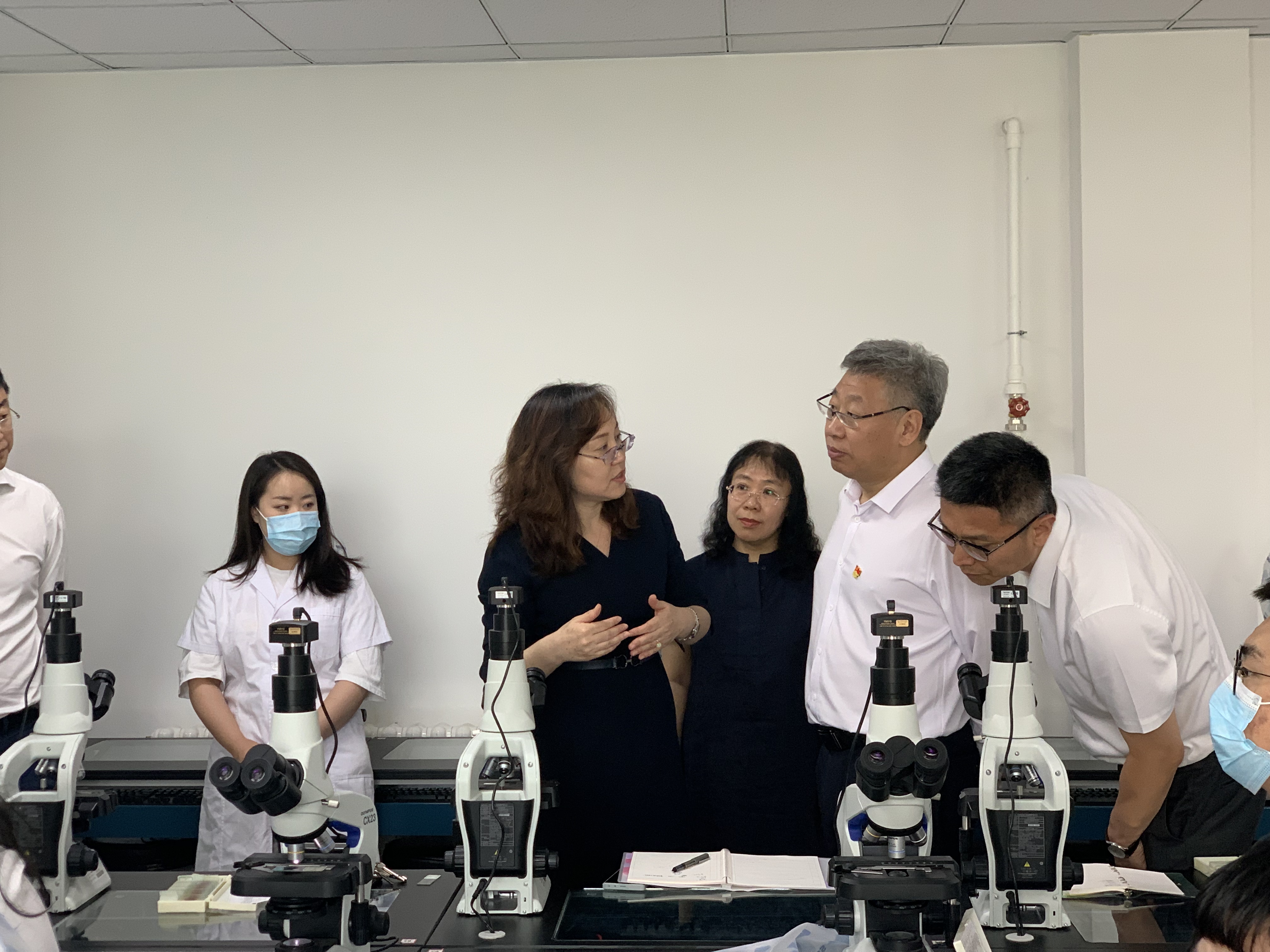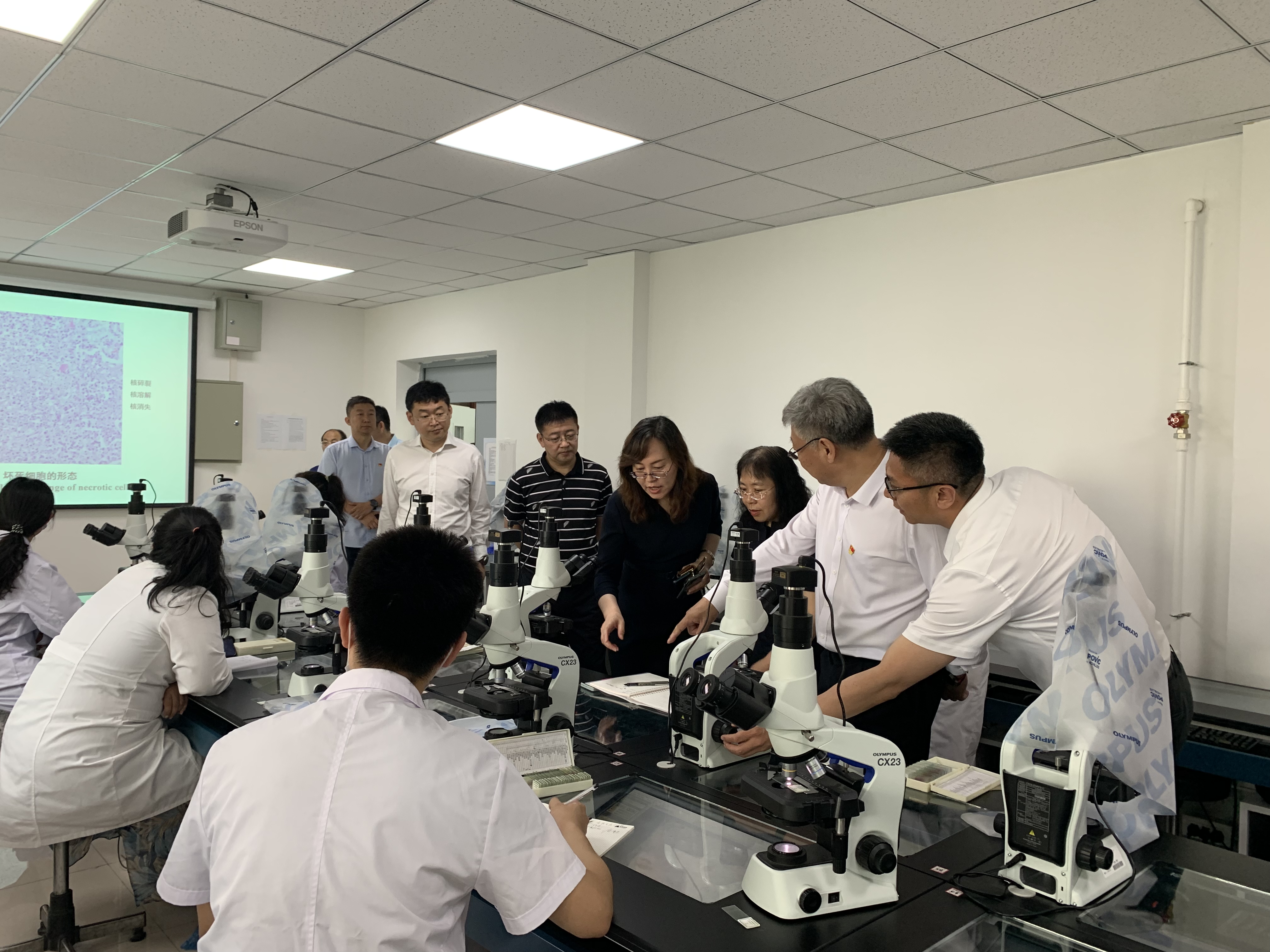 冯正玉书记首先听取基础医学院院长王放的工作汇报,随后,走进实验室向师生表达问候。在可移动实验平台,于蕾老师和学生们正在做的家兔呼吸运动的调节手术演示实验,学生可通过清晰的大屏幕看到手术演示全过程,真正实现互联互通,实时互动。在病理实习课堂,观摩了何旭老师“损伤的修复”课程,观看了学生的实验演示并亲切问候同学们的学习状况,病理生物学教育部重点实验室主任、副院长辛颖向冯书记介绍了病理学形态实验的相关情况。冯书记对同学们的实操能力给予了充分肯定。在分子生物学实验室,老师正在带领同学们进行转基因斑马鱼克隆实验。斑马鱼是国际上用于快速研究人类疾病信号传导途径、有效药物高通量筛选的最佳模式生物之一。冯书记对学院在斑马鱼方面的前沿研究表示肯定并寄予厚望,期待学院的斑马鱼研究能在探索人类疾病发病机理,筛选治疗靶点,进行新药开发以及药物毒性与安全性评价上发挥更大的作用。最后,冯书记一行来到医学影像虚拟解剖联合实验中心检查调研,参观3D打印白求恩像,观看了基础医学院宣传片。