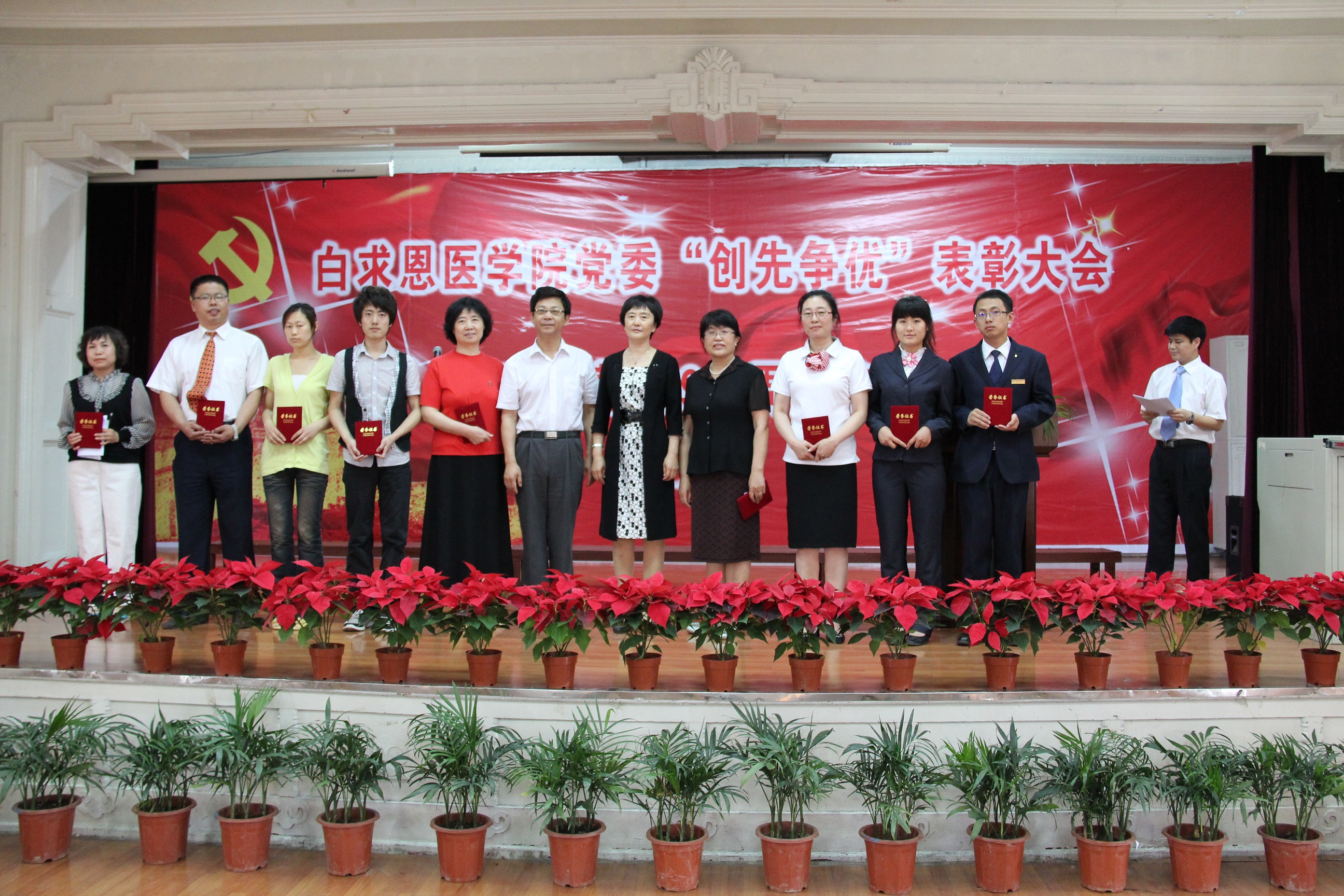 “创先争优”表彰大会由白求恩医学院党委书记屈英和主持,大会在庄严的国际歌中拉开帷幕。首先,屈英和介绍了白求恩医学院“创先争优”活动的开展情况,学院党委委员、常务副院长孙连坤宣读了《关于表彰2008-2011年度“创先争优”活动先进党支部、优秀共产党员、优秀党务工作者的决定》,陈权、兰恒斌、于传波、申桂香、聂宏凯、董汉良分别为获奖代表颁奖。教工第七党支部书记夏映红、教工党员王医术分别代表先进党支部、优秀共产党员发言。