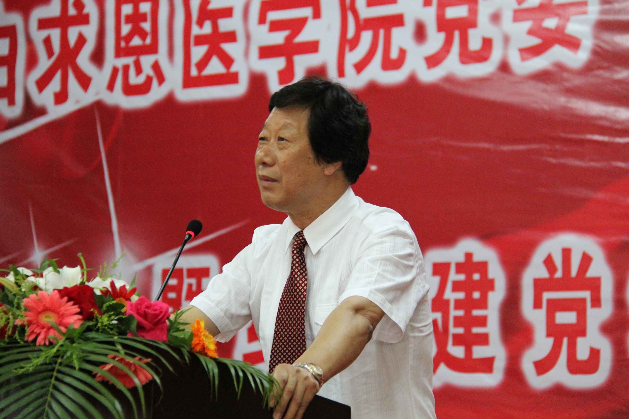 随后,白求恩医学院党委委员、院长李玉林发表讲话。他首先代表学院党委、行政对受到表彰的支部和个人表示由衷的祝贺和崇高的敬意,并号召全院党员同志学习先进,为建设高水平研究型学院贡献力量。李玉林在讲话中指出,白求恩医学院党委是勤政廉洁、求真务实、团结合作的党委;拥有着勇于奉献、处处发挥党员先锋模范作用的党员同志们;在党的组织建设中成效显著,充分体现了党的号召力、凝聚力、战斗力;在作风建设和组织支部学习中具有开拓和创新精神,成绩突出。李玉林希望院党委继续围绕学院中心工作发挥核心作用,做好监督保障,党员同志以身作则带动全体教师,坚持以白求恩精神育人,以丰富多彩的活动提高校园文化的品味、提升白求恩精神的内涵。