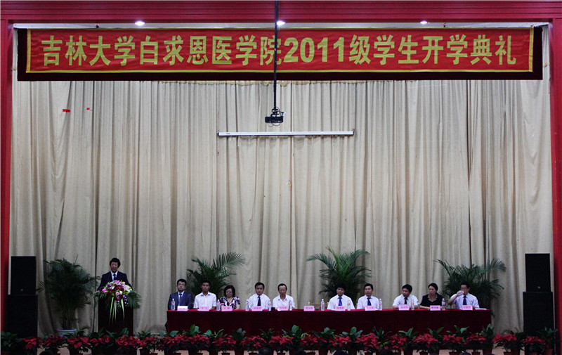 8月30日下午,白求恩医学院在中心校区经信报告厅隆重举行2011级学生开学典礼。白求恩医学院院长李玉林、党委书记屈英和,白求恩第一医院党委书记张东航,白求恩医学院常务副院长孙连坤、副院长孟祥伟、韩丽华、吴运涛,白求恩第二医院党委副书记兼副院长于静,中日联谊医院党委副书记兼副院长王飞等领导出席了典礼。典礼由白求恩医学院党委副书记兼副院长苑锐主持。