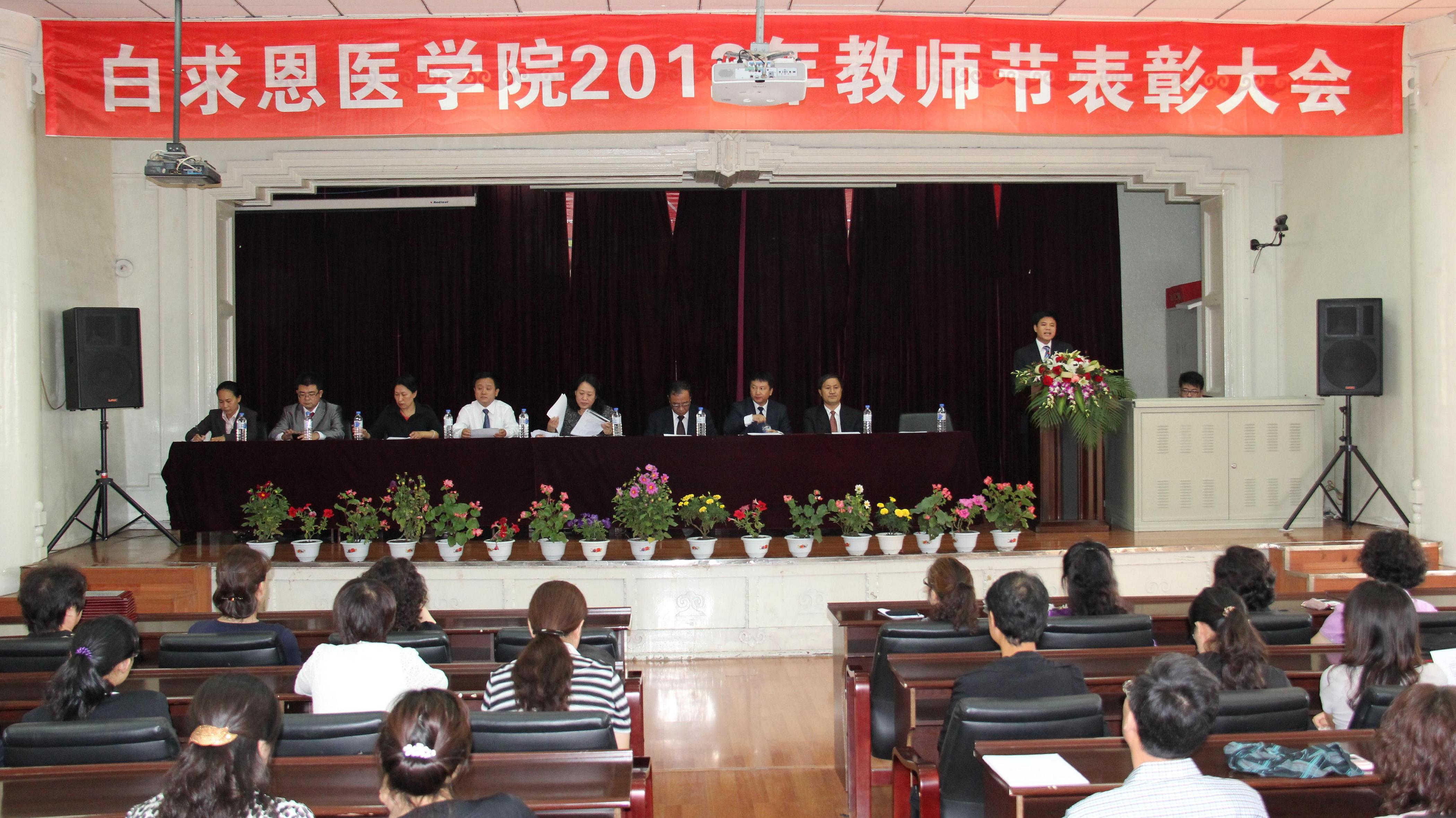 金秋九月,丹桂飘香,在第28个教师节当天,9月10日上午,白求恩医学院在基础楼二楼多功能学术报告厅隆重召开2012年教师节表彰大会。对在教学、科研等工作中做出突出贡献的教师进行表彰。白求恩医学院全体院领导及教职员工参加了大会。会议由学院党委书记屈英和主持。
