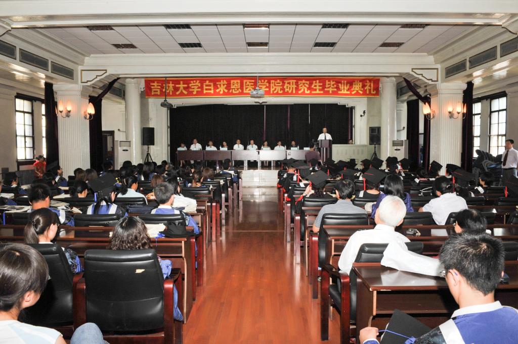 2010年6月24日下午,白求恩医学院在基础二楼多功能报告厅隆重举行2010届研究生毕业典礼。原吉林大学常务副校长、白求恩医学院院长李玉林、学院党委书记屈英和、常务副院长孙连坤、基础医学学位评定分委员会主席王丽颖、学院各位领导、2010届基础医学博士毕业生、硕士毕业生、部分教师代表和部分毕业生亲属出席了毕业典礼。毕业典礼由学院副院长李一雷主持。