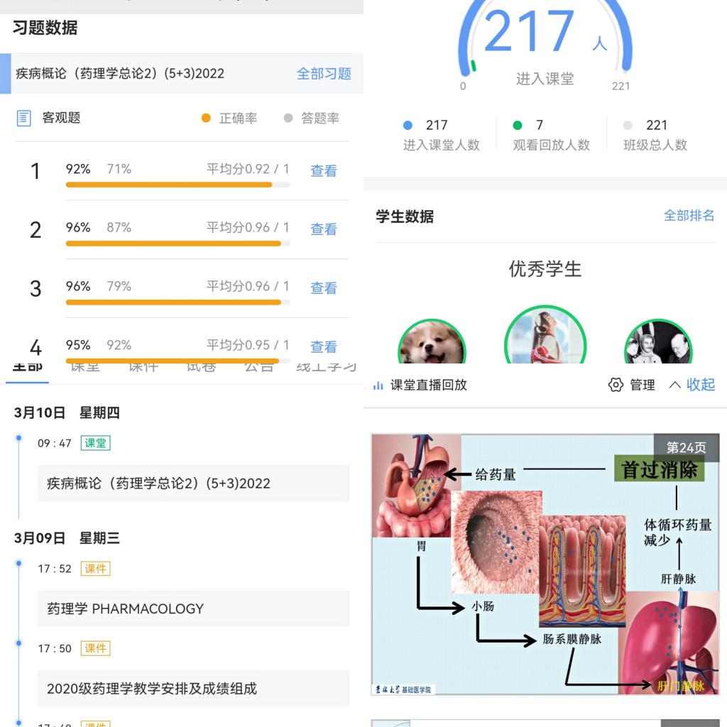 本学期基础医学院共计承担专业基础课程44门次,总学时2476学时,选课学生达6455人次。面对突然的教学模式的转变,各学系按照新学期提交的应急预案及时启动在线教学方案,稳步推进既定的教学进程,本次线上教学多采用超星学习通在线直播的方式,并随堂实施主题讨论、测试、讨论等教学活动,师生在线上体会了真正的“互动”。此外,经过与上海梦之路虚拟软件平台沟通,开放了341项基础医学类实验项目,作为教学补充资源供师生使用。
