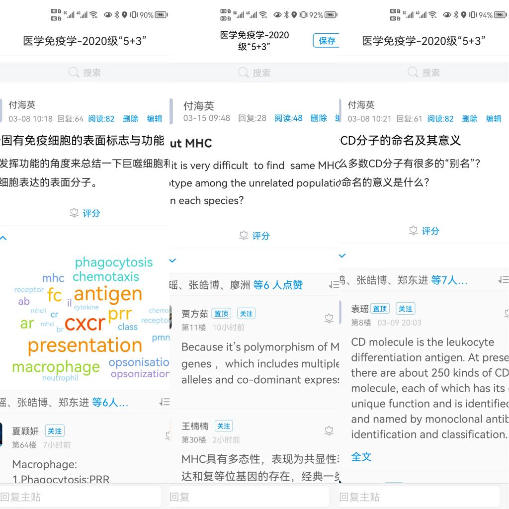 为了做好2020级医学“5+3”一体化本科生《医学免疫学》课程的线上教学,负责本教学轨道的付海英老师和杨巍老师通过开课前、线上教学前及开课三周后的学习通问卷调查及学生的个别沟通,在充分了解学生学习习惯以及学习需求的基础上,以学业挑战度、学习效果双保证为理念,与2020级医学“5+3”一体化的学生们一起就学习内容、教学方式、平台使用等多方面互相讨论、互相学习,教学相长,在良好的学习氛围中共同建立了超星学习通平台结合腾讯会议的《医学免疫学》线上双语教学新模式: